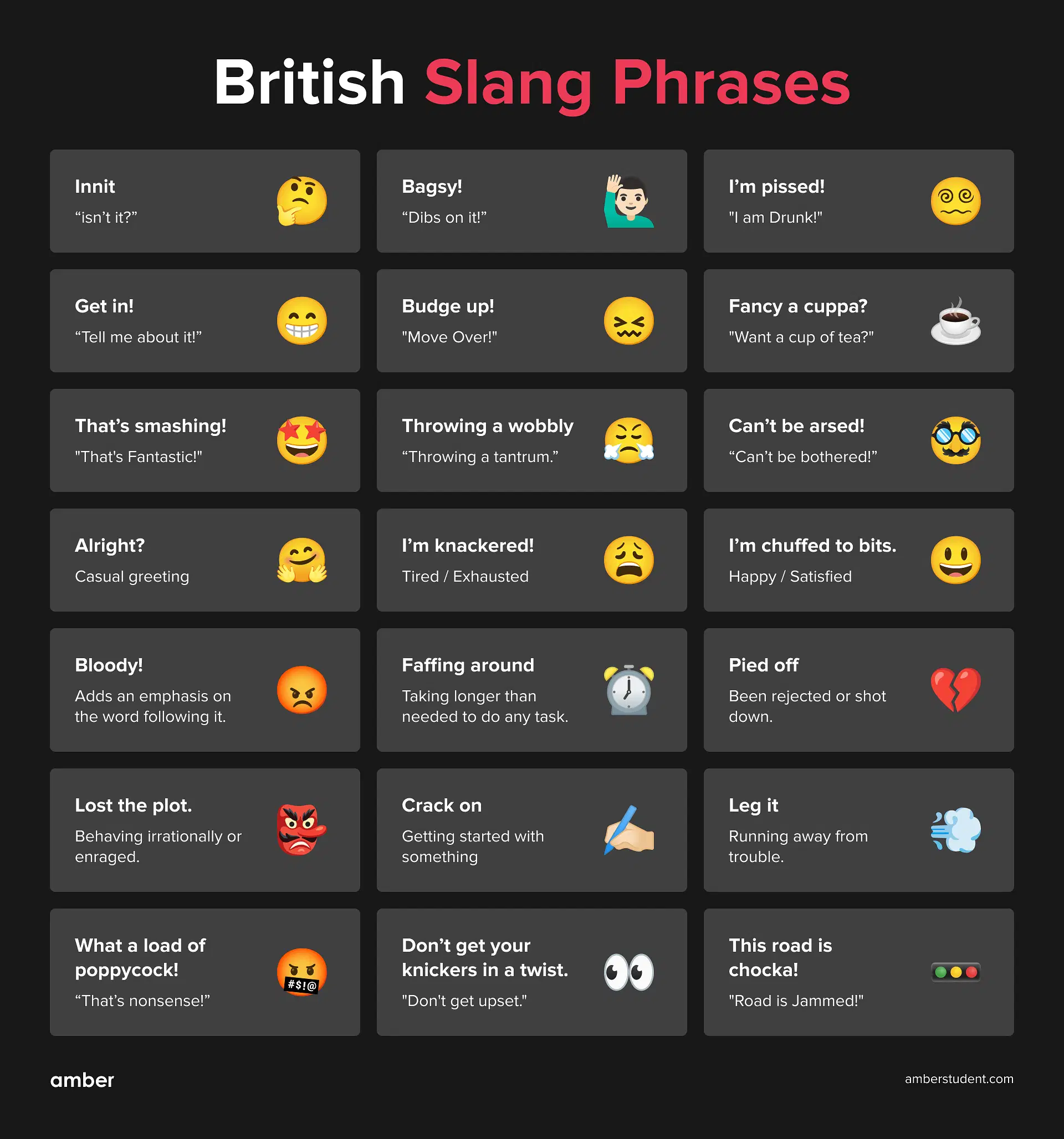 English speakers in the U.K. have one of the most researched, documented, and exhaustive slang vocabularies in existence. In fact, a seven-volume British slang dictionary was published in 1889. Since then several other English slang dictionaries, and research studies have been published. Below is a list of common British slang words, and idioms. These may be noteworthy if, for example, you’re an American business that is interested in expanding into British markets. Remember that you shouldn’t assume your Amero-centric website will be sufficient to connect with British audiences purely because it’s written in English. With that in mind, some of these terms may come in handy.