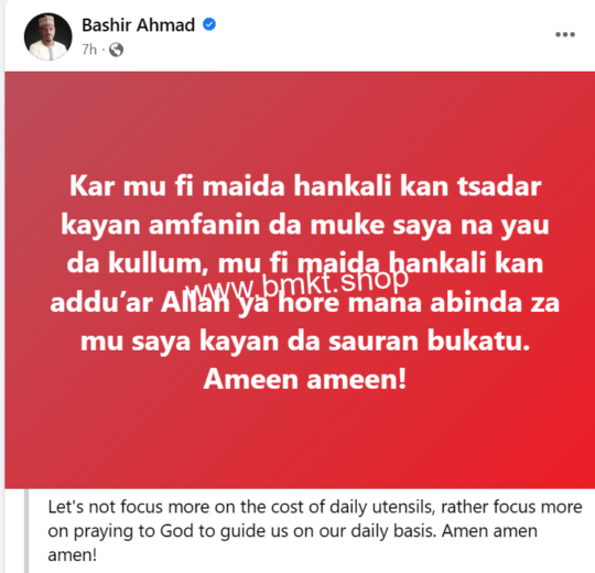 Former presidential aide, Bashir Ahmad has shared a new Facebook post written in Hausa hours after the NNPC increased the pump price of fuel to N617. In the post he shared, Bashir stated that rather than focus on cost of daily items, Nigerians should pray to God to guide us on a daily basis. He wrote; Let’s not focus more on the cost of daily utensils, rather focus more on praying to God to guide us on our daily basis. Amen amen amen! The post Rather than focus on cost of daily items, we should pray to God to guide us on a daily basis – Former presidential aide, Bashir Ahmad writes amid rising cost of living in the country appeared first on ringroad.com.ng.
