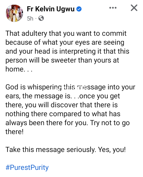 Nigerian Catholic priest, Fr. Kelvin Ugwu has warned married men against committing adultery. That adultery that you want to commit because of what your eyes are seeing and your head is interpreting it that this person will be sweeter than yours at home. God is whispering this message into your ears, the message is. . .once you get there, you will discover that there is nothing there compared to what has always been there for you. Try not to go there! Take this message seriously. Yes, you, he said in a Facebook post on Thursday, August 10. The post There is nothing there compared to what has always been there for you – Nigerian Catholic priest, Fr. Kelvin Ugwu warns married men against adultery appeared first on ringroad.com.ng.