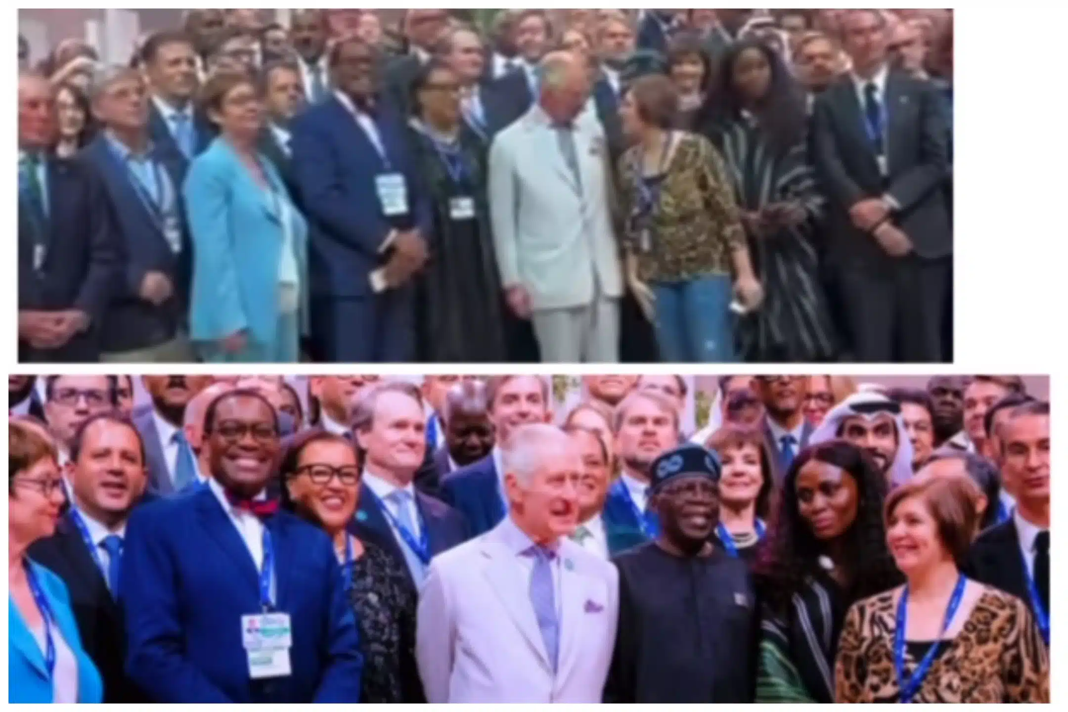 A group photograph with King Charles after the COP28 Climate Summit shows how a lady was covering President Tinubu, making him invisible, before the photographer alerted her.