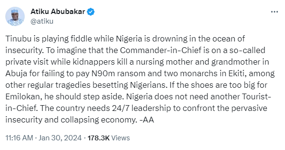 The Presidency has responded to the tweet released earlier today by Atiku Abubakar tackling President Tinubu for travelling out of the country for a private visit when the nation is in an ocean of insecurity. Atiku in his tweet said the President cannot be travelling when the Nation is being attacked by kidnappers and other assailants. He went on to say that if the shoes are too big for President Tinubu to wear, he should step aside. Reacting to Atiku’s comment, the Special Adviser to the President on Information and Strategy, Bayo Onanuga, described it as reckless’. He further stated that the President is on top of all domestic issues including security. His statement reads President Tinubu on top of domestic situation: Alhaji Atiku Abubakars statement accusing President Bola Ahmed Tinubu of fiddling amidst some security and economic challenges is to say the least, reckless. Coming days after he made an equally reckless allegation against the President on the crude for loan deal for NNPC Limited, his latest statement fell short of what is expected from an elder statesman. We like to believe that Alhaji Atiku is still not nursing hangover of his electoral defeat and now latches on any issue to attack President Tinubu. President Tinubu did not travel without informing Nigerians of his whereabouts. He announced a private visit to France and announced a return date. While in France, President Tinubu has been following developments at home and he is on top of the situation in the country. Todays inauguration of the Tripartite Committee on National Minimum wage bore his imprimatur . He is in constant touch with his officials and security chiefs and has directed them to stamp out every form of criminality in the country. He has particularly ordered them to apprehend those criminals responsible for the murder of two monarchs in Ekiti State and the kidnapping of some pupils in the state. We are already seeing results with the arrest of over 139 kidnappers around Abuja, Kaduna and Benue States in the last one week. The police Special Intervention Squad (SIS) and DSS have also rescued 154 abducted persons in the last few days. Just last week President Tinubu approved N50billion as Special Fund to address some of the lingering security challenges in North East where Alhaji Atiku hails from. To cope with the kidnapping challenges in the FCT, President Tinubu also approved funds for the acquisition of equipment to track criminals. If Alhaji Atiku is really concerned about security issues and not playing cheap politics, he should have known that President Tinubu is on top of issues and working hard to restore peace to every part of our country. Our security agencies are working very hard to bring the security situation under control. President Tinubu is giving them all the necessary support they need to win the battle against criminal elements and secure every inch of our country. Bayo OnanugaSpecial Adviser to the President on Information & Strategy The post Accusing President Tinubu of fiddling amidst some security and economic challenges is to say the least reckless – Presidency replies Atiku appeared first on .