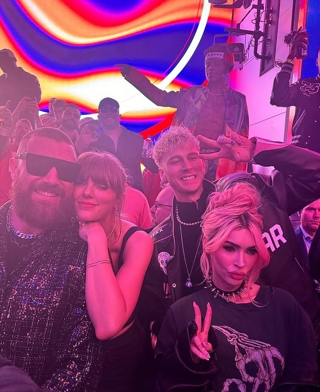 Taylor Swift, Travis Kelce together with Megan Fox, Machine Gun Kelly celebrating after Super Bowl