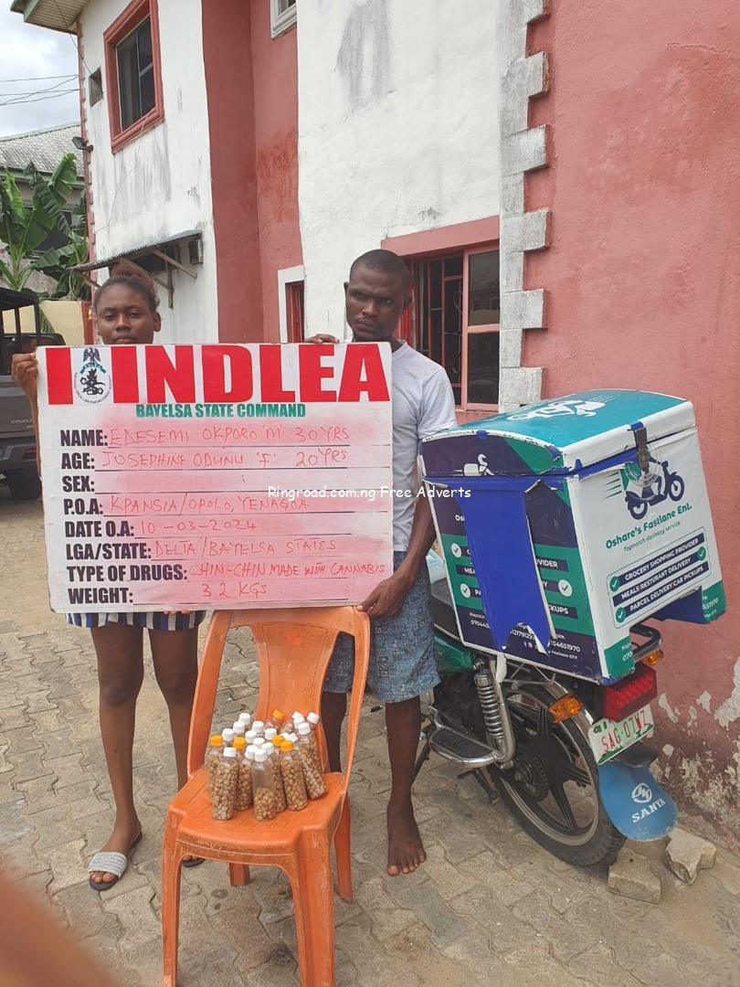 Operatives of the National Drug Law Enforcement Agency (NDLEA) have arrested a 20-year-old hair stylist, Josephine Odunu and a 30-year-old dispatch rider, Edesemi Ikporo, for selling and distributing illicit drug-laced chin-chin to school students and at social parties in Yenagoa, Bayelsa state. A press statement by the spokesman of the anti-narcotics agency, Femi Babafemi said NDLEA officers on patrol around Opolo area of Yenagoa had on Sunday 10th March 2024 intercepted the motorcycle dispatch rider, Edesemi and recovered 200 grammes of chin-chin produced with cannabis sativa, which he was on a mission to deliver to a buyer. He said a swift follow up operation led to the arrest of the hairdresser, Josephine, who distributes the drugged chin-chin from the salon where she works in Kpansia area of Yenagoa, the search of the salon led to the recovery of 3 kilogrammes bringing the total weight of the illicit substance seized from the duo to 3.2 kilogrammes. He noted that investigations revealed that they distributed the chin-chin often laced with cannabis and tramadol to students and at birthday parties, with Edesemi handling the delivery to buyers, Josephine is a major distributor to a wanted suspect who produced the drugged chin-chin. In the same vein, NDLEA operatives in Adamawa state last Wednesday arrested two wanted suspects, Ajim Samuel (aka Boss), 30, and Davidson Joshua (aka Dantala), 36, while on their way from Onitsha, Anambra state where they had gone to buy a consignment of tramadol containing 14,428 pills of the opioid which they tucked in the body compartments of their black Honda Civic car marked YLA 623 SL. They were nabbed along Numan-Jalingo road, recovered from them were 21 grammes of cannabis and monetary exhibits totaling N19,280. The post NDLEA apprehends hair stylist and dispatch rider peddling Cannabis-laced chin-chin to students appeared first on .