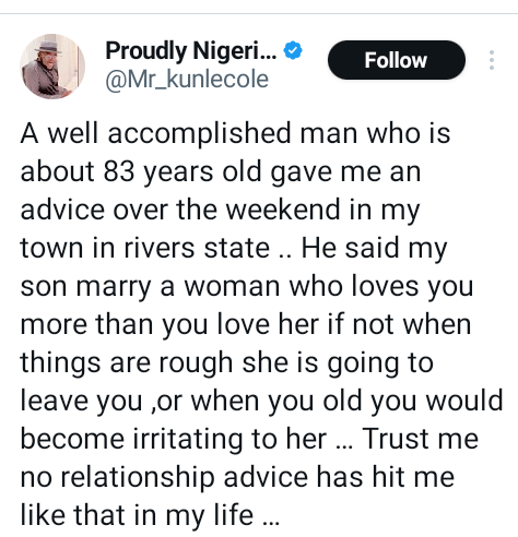 A Nigerian lawyer, Kunle Cole, has revealed the best piece of relationship advice he received from a well accomplished 83-year-old man. A well accomplished man who is about 83 years old gave me an advice over the weekend in my town in rivers state. He said my son marry a woman who loves you more than you love her if not when things are rough she is going to leave you ,or when you old you would become irritating to her Trust me no relationship advice has hit me like that in my life, he wrote on Tuesday. The post “Marry a woman who loves you more than you love her if not when things are rough she will leave you” – Nigerian lawyer shares advice he received from an elderly man appeared first on Ringroad.com.ng Sell Buy Online For Free ! .