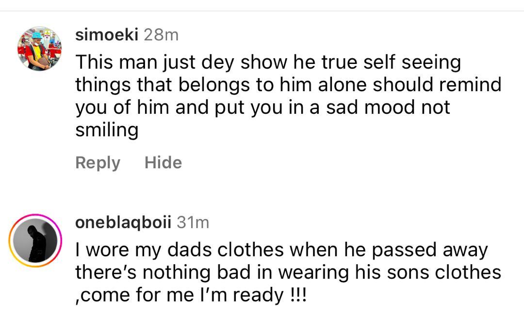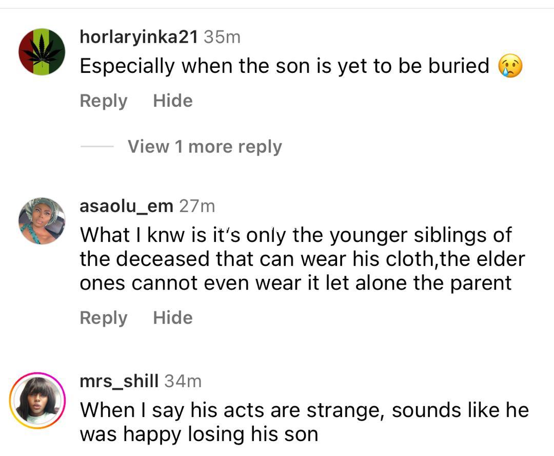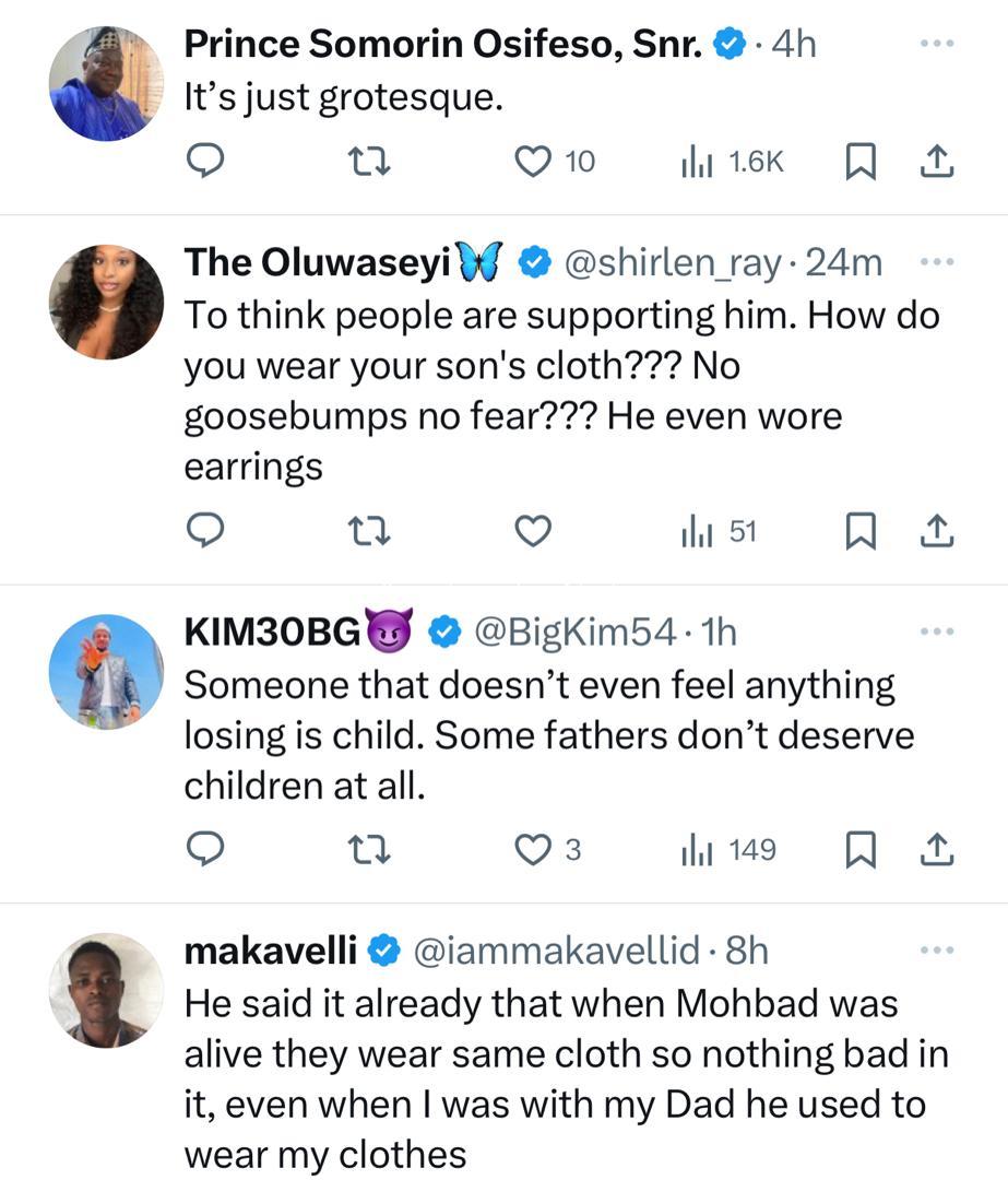 Nigerians on social media are reacting to a trending video of Mohbad’s father, Joseph Aloba, wearing the late singer’s clothes and defending his action. The father of the deceased singer has been spotted a few times rocking what many say are his son’s clothes. An interviewer accosted him recently and asked him to react to the concerns of some Nigerians who believe it is inappropriate for him to wear his late son’s clothes. Responding, Mr Aloba said; That question is not what I can be answering but my focus now is the justice for my son but let me just answer that in a brief way. He is my son and I can wear his clothes because we are the same size and anybody that has that kind of a son and cannot share with him, that means that person doesn’t love the son. I could remember the day they wanted to go and do introduction that leads to engagement, he bought me a shoe and said daddy this is what you are going to wear. I said this is bigger than me and I don’t want this kind of a bogus (shoe)..He wante dto blend me. He is my son and he is a friend to me. My focus now is justice for Mohbad. He is my son, I wear his clothes. Whoever that wants to say anything should say whatever they like.” Many Nigerians have reacted to his comments and his action. While some find it weird, others argue that he should be allowed to do whatever he likes as people mourn differently. Watch the video of him speaking and see the different reactions below Follow us on Instagram…Powered By ADNG.NG free ads A post shared by Top Online Money Making Website dotifi.com start an online business for free and earn