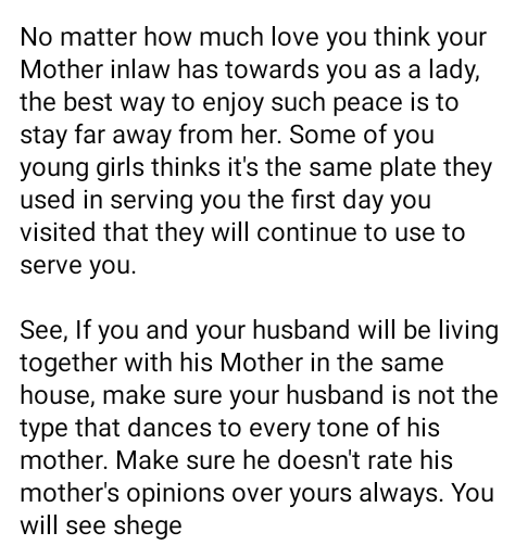 A Nigerian man, Okey Aliyu, has advised women to be mentally, psychologically and emotionally prepared if they plan on living in the same house with their mother-in-law after wedding. Okey gave the advice in a Facebook post on Wednesday, April 24. If you will be staying in the same house permanently with your husband and mother in-law, especially Anambra Mother in-law after wedding as a lady, please think, rethink and over think your choice and make sure you are mentally, psychologically, emotionally and physically fit to cope, he wrote. I have said these things times without number but many of you don’t use to rate me. You think I just love to rant online or dive into discussion I have no experience on. No matter how much love you think your mother in-law has towards you as a lady, the best way to enjoy such peace is to stay far away from her. Some of you young girls thinks it’s the same plate they used in serving you the first day you visited that they will continue to use to serve you. See, If you and your husband will be living together with his mother in the same house, make sure your husband is not the type that dances to every tone of his mother. Make sure he doesn’t rate his mother’s opinions over yours always. You will see shege Then if he now has single sisters who have come of age staying together as well in the same house with their mother and your husband, congratulations to you. Na glorified slave you go be. Shege pro max If you like don’t read to understand and borrow yourself sense. Come here to tell me how good some mother in-laws are. Tell me how I shouldn’t talk about Anambra Mothers Eat shawarma and ice cream this week and throw my advise away. Na You go hear am hot hot when e go set. The post Don’t live in the same house with your mother in-law except you are mentally prepared to handle stress – Nigerian man advises married women appeared first on Swordpress.com.ng.