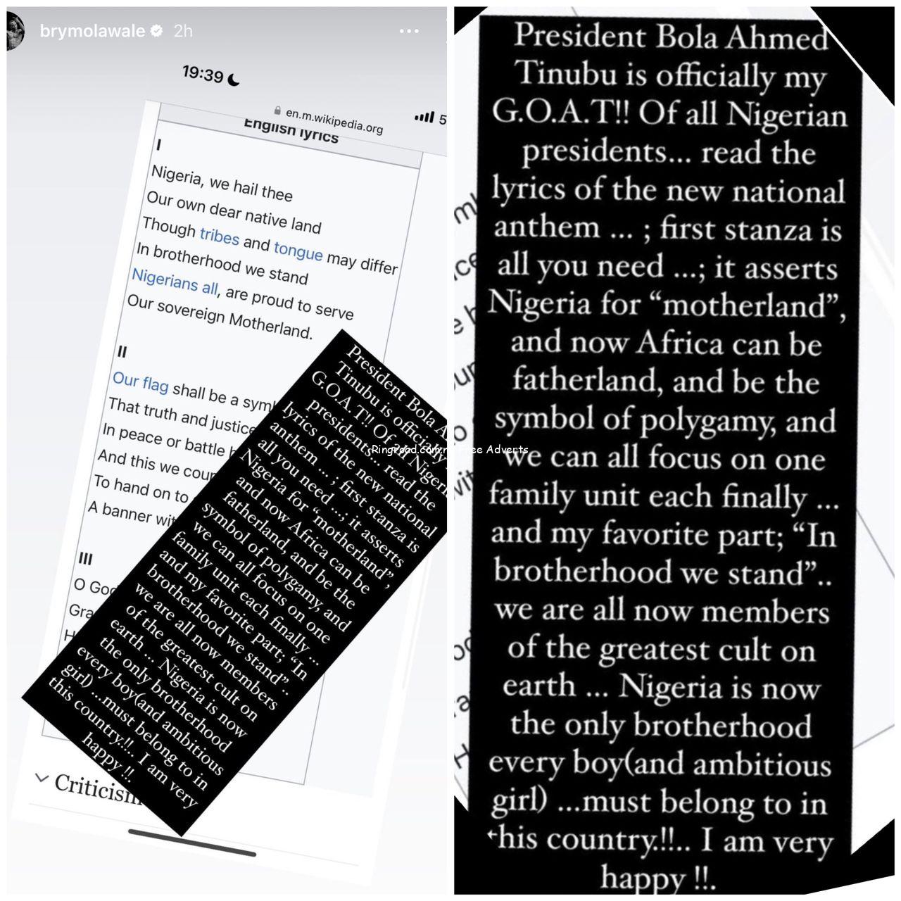 Singer, Brymo Olawale has thrown his weight behind the Federal government’s decision to revert to the old National Anthem. In a post shared on Instagram, Brymo said he is very happy with the decision. He described President Tinubu as the Greatest of All Times, GOAT” of all Nigerian presidents. Read his post below The post I am very happy – Singer Brymo expresses joy over the return of the old National anthem appeared first on dotifi.com start an online business for free and earn .
