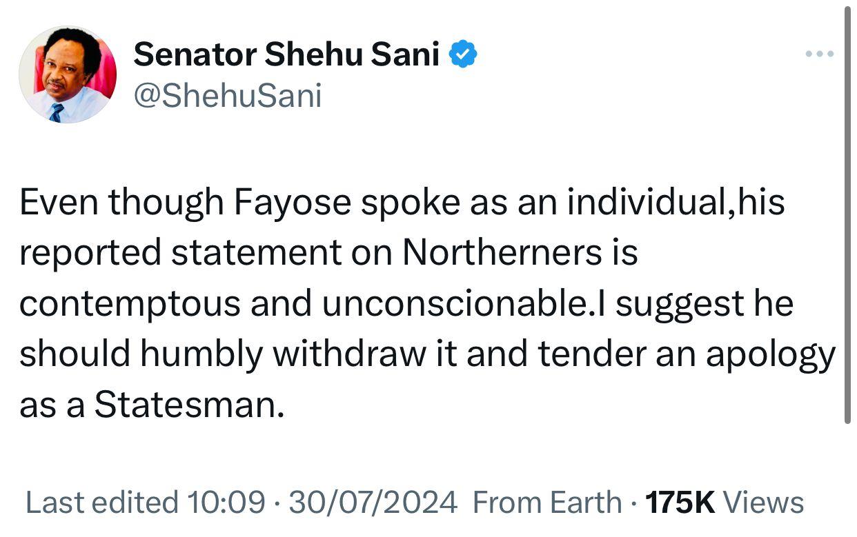 Senator Shehu Sani has urged former Ekiti State governor, Ayo Fayose to tender an apology to Northerners following his comments on people of the region. Fayose in an interview on Channels TV on Monday, July 29, inferred that poor men having numerous wives and children they cannot cater to is a problem in Nigeria and a huge burden on the government. In his analogy, he referenced his visit to a Northern state where he interacted with a security guard in a government house who earns N34,000 and has four wives and sixteen children. Sani like other Northerners, found his comment unacceptable and asked him to apologize. Reacting in a post on his official X handle on Tuesday, the former lawmaker said Fayoses statement is contemptuous and unconscionable.” Even though Fayose spoke as an individual, his reported statement on Northerners is contemptuous and unconscionable. I suggest he should humbly withdraw it and tender an apology as a statesman, Sani stated Undeterred, Fayose reposted a tweet by his former aide, Lere Olayinka, insisting that his comment is valid. The post ‘Apologise to Northerners over many children comment – Senator Shehu Sani tells former governor Ayo Fayose appeared first on Swordpress.com.ng.