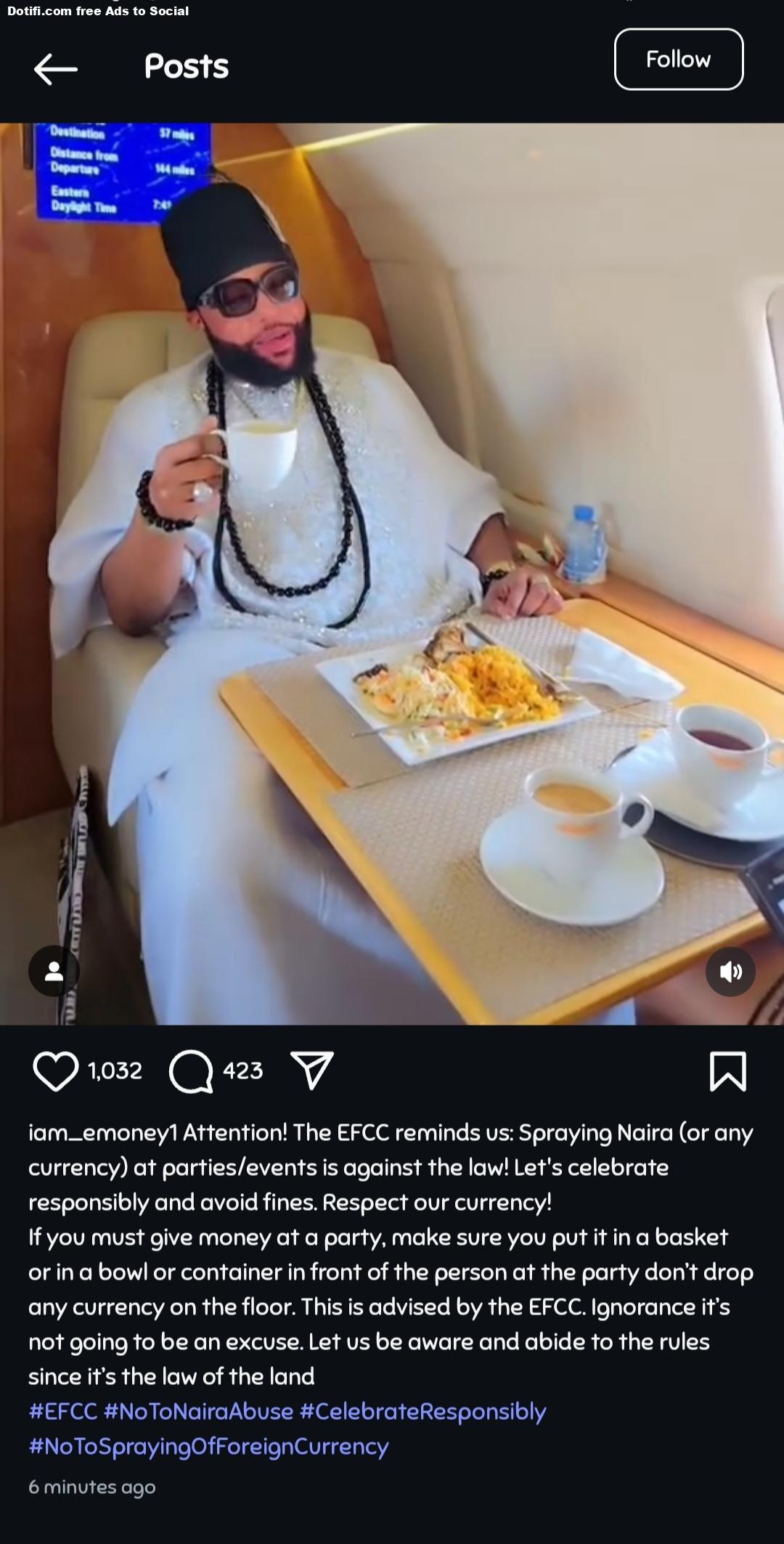 Popular businessman and socialite Emeka Okonkwo, widely known as E-Money, has broken his silence following his arrest by the Economic and Financial Crimes Commission (EFCC) over alleged abuse of the Naira and foreign currency. E-Money was reportedly picked up from his Lagos home and flown to Abuja for questioning after viral videos showed him spraying money at public events a direct violation of the Central Bank of Nigerias cash handling laws. He was later released the same day. In a post made shortly after his release, E-Money shared a video of himself with the caption:Attention! The EFCC reminds us: Spraying Naira (or any currency) at parties/events is against the law! Lets celebrate responsibly and avoid fines. Respect our currency!He added,If you must give money at a party, make sure you put it in a basket or in a bowl or container in front of the person… Ignorance is not going to be an excuse.The post sparked mixed reactions, with some commending his composure and others criticizing the EFCC for selective enforcement.This arrest adds to a growing list of public figures who have come under scrutiny for the lavish display of cash at events.Here’s the post belowThe post Respect the Law E-money speaks out after EFCC arrested him over Naira spraying appeared first on searchng.ng by Dotiifi Digital www.dotifi.com.