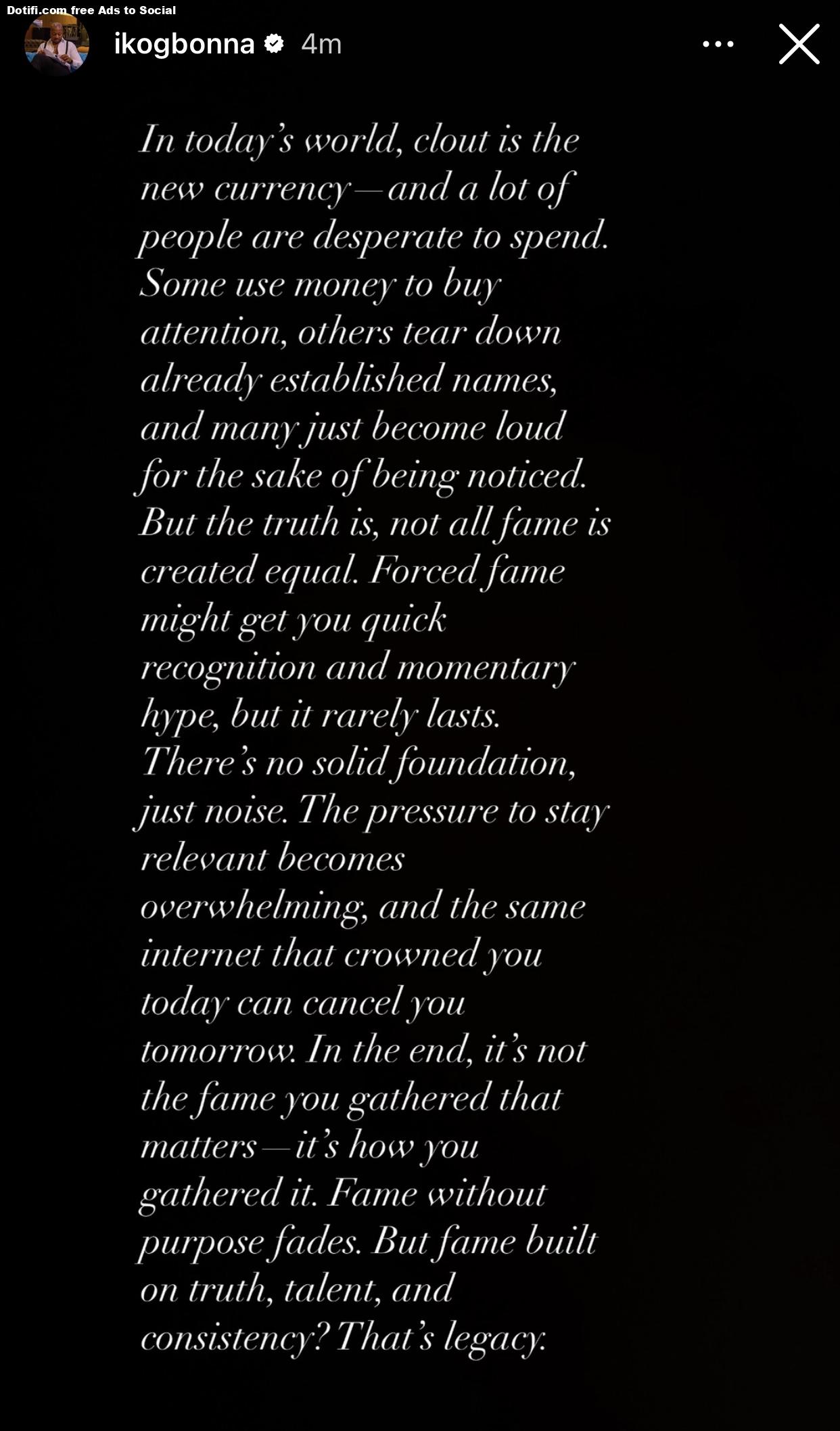 IK Ogbonna is not here for the clout-chasing generation and he made that clear in a recent Instagram story thats now making waves. In todays world, clout is the new currency, he wrote. And a lot of people are desperate to spend. The actor didnt hold back, calling out the different routes people take for attention from tearing down others to chasing empty hype. But he was quick to point out the trap: quick fame with no foundation crumbles fast. The same internet that crowned you today can cancel you tomorrow, he warned. See full post below… The post Clout Is the New Currency Actor, IK Ogbonna shares opinion on todays fame culture appeared first on Time.com.ng.