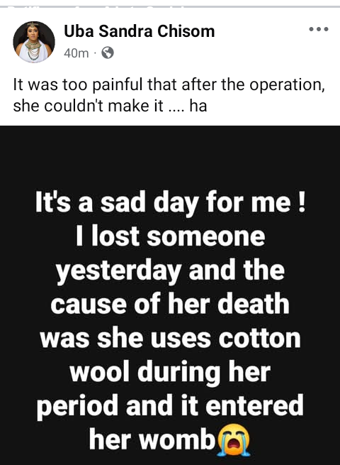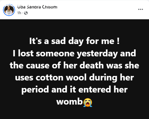 A Nigerian woman, Uba Sandra Chisom, has mourned a lady who allegedly d!ed after undergoing an operation to remove cotton wool from her womb. Sandra, who disclosed this in a Facebook post on Friday, May 9, said the woman used the cotton during her period, and it apparently caused an infection. It’s a sad day for me ! I lost someone yesterday and the cause of her death was that she uses cotton wool during her period and it entered her womb, she wrote. It was too painful that after the operation, she couldn’t make it. The post Nigerian lady mourns woman who allegedly d!ed after cotton wool she used during period “entered her womb” appeared first on Time.com.ng.