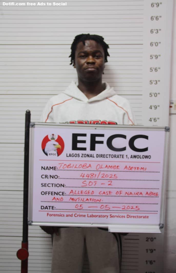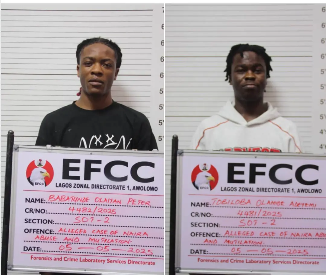 The Lagos Zonal Directorate 1 of the Economic and Financial Crimes Commission, EFCC, has secured the conviction and sentence of Babatunde Peter Olaitan and Tobilola Olamide to six months imprisonment each for mutilation of the Naira notes. They were jailed on Thursday, May 8, 2025, by Justice Alexander Owoeye of the Federal High Court sitting in Ikoyi, Lagos. The convicts were arraigned on a separate one-count charge of tampering with the Naira notes and spraying, to which they each pleaded guilty. The charge against Olaitan reads: That you, BABATUNDE PETER OLAITAN, on 8th April 2025, at 23, Macdonald Road, Ikoyi, Lagos, within the jurisdiction of this Honourable Court, whilst dancing during a social event, tampered with funds in the denomination of N200 (Two Hundred Naira) issued by the Central Bank of Nigeria by spraying it, and you thereby committed an offence contrary to and punishable under Section 21(1) of the Central Bank Act, 2007. The charge against Olamide reads: That you, TOBILOLA OLAMIDE A.K.A TobiNation, on 8th April 2025, at 23 Macdonald Road, Ikoyi, Lagos, within the jurisdiction of this Honourable Court, whilst dancing during a social event, tampered with funds in the denomination of N200 (Two Hundred Naira) issued by the Central Bank of Nigeria by spraying it, and you thereby committed an offence contrary to and punishable under Section 21(1) of the Central Bank Act, 2007. In view of their pleas, prosecution counsel, C.C. Okezie and H.U.KofarNaisa, respectively, reviewed the facts of the cases through Ibrahim Bukar, an investigative officer with the EFCC. In his evidence, Bukar specifically told the court that the Commission, on April 10, 2025, generated an intelligence-driven investigation on TikTok, where Olaitan, also known as TDollar, was seen spraying Naira notes. He also told the court that Upon the approval of the intelligence by the Zonal Director, a letter of investigation was sent to the defendant, requesting him to make a statement regarding the video. The defendant reported to the Special Operations Team, SOT, on May 5, 2025 and his statement was recorded under caution. He stated that he went to a night club on April 8, 2025 and met some of his fans sharing money. “He also said that a fan, in the process, gifted him a bundle of N200 notes, which he sprayed on some of his other fans. “He was shown a video of him spraying the money and he made a statement regarding it. Consequently, the defendants extrajudicial statements and video recordings were rendered and admitted in evidence by the court. Okozie and KofarNaisa, therefore, respectively prayed the court to convict and sentence the defendants accordingly. Justice Owoeye convicted and sentenced both Olaitan and Olamide to six months imprisonment each, with an option of fine in the sum of N200,000 (Two Hundred Thousand Naira. The convicts’ road to the Correctional Centre started when they were arrested by operatives of the EFCC for Naira abuse. They were charged to court and convicted.