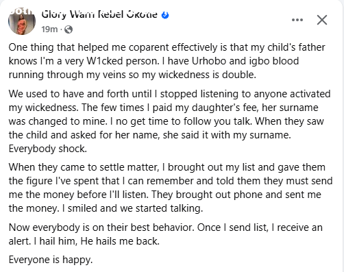 A Nigerian woman, Glory Okotie, said that co-parenting with her child’s father has been effective since she activated her wickedness. Okotie, who disclosed this in a Facebook post on Friday, said co-parenting was marred by conflict and constant back and forth until she decided to stop listening to people. She said she changed her daughters surname to her maiden name after she started paying the childs school fees and this made by in-laws to take more responsibility for the child. One thing that helped me co-parent effectively is that my child’s father knows I’m a very W1cked person. I have Urhobo and Igbo blood running through my veins so my wickedness is double, she wrote. We used to have back and forth until I stopped listening to anyone and activated my wickedness. The few times I paid my daughter’s fee, her surname was changed to mine. I no get time to follow you talk. When they saw the child and asked for her name, she said it with my surname. Everybody shock. When they came to settle matter, I brought out my list and gave them the figure I’ve spent that I can remember and told them they must send me the money before I’ll listen. They brought out phone and sent me the money. I smiled and we started talking. Now everybody is on their best behavior. Once I send list, I receive an alert. I hail him, He hails me back. Everyone is happy The post One thing that helped me co-parent effectively is that my child’s father knows I’m a very w!cked person – Nigerian woman says appeared first on Time.com.ng.