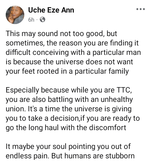 A Nigerian woman, Uche Eze Ann has said that when a woman finds it difficult to conceive with a particular man, it might be because she is in an unhealthy union or the universe doesn’t want them to be part of his family. This may sound not too good, but sometimes, the reason you are finding it difficult conceiving with a particular man is because the universe does not want your feet rooted in a particular family, she wrote in a Facebook post on Sunday. “Especially because while you are TTC, you are also battling with an unhealthy union. It’s a time the universe is giving you to take a decision,if you are ready to go the long haul with the discomfort. It maybe your soul pointing you out of endless pain. But humans are stubborn. The post The reason you are finding it difficult conceiving with a particular man is because the universe doesn’t want your feet rooted in his family – Nigerian woman says appeared first on Time.com.ng.