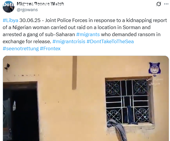 Police in Libya have arrested members of a suspected Nigerian kidnap gang that abducted a Nigerian woman and demanded ransom for her release. According to Migrant Rescue Watch, Joint Police Forces in response to a kidnapping report of the Nigerian woman, carried out a raid on a location in Surman city, Tripolitania region of northwestern Libya on Monday, June 30, 2025 and arrested the gang. The victim was rescued while the kidnappers were sent to jail.