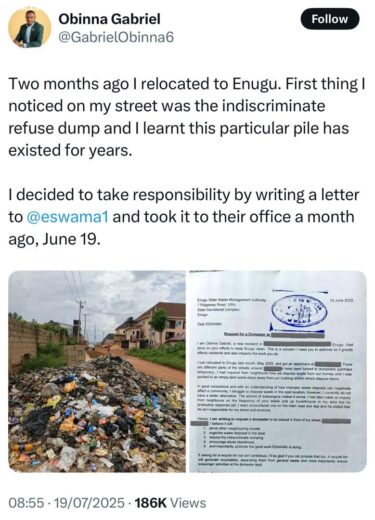 A Nigerian man on social media has appealed to Nigerians to be the change they desire to see in their communities. His advice came in after a simple step he took led to environmental changes in his community. According to him, he relocated to his community in Enugu state two months ago and he noticed a heap of refuse he was told had been there for some years. He said he took it upon himself to write the state waste management community and in no distant time, they came in and cleared the heap of dirts. The post Lead the change you want to see in your community- Nigerian man writes after a simple step he took led to environmental changes in his community appeared first on Time.com.ng.
