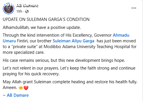 Suleiman Aliyu Garga, a Special Assistant on Content Creation to the Governor of Adamawa State, Ahmadu Umaru Fintiri, has passed away three days after he complained of acute toothache. Garga took to Facebook on Thursday, July 17, 2025, urging people to pray to God against toothache. You should pray to God to save you from toothache even if it is for 1 minute Alaji. Allah is sufficient for us and He is the best disposer of affairs, he wrote. Garga was admitted at the Modibbo Adama University Teaching Hospital where he underwent a surgery. It was gathered that the surgery site started bleeding and he passed away on Saturday, July 20, 24 hours after the procedure. Garga was laid to rest at the Yolde Pate Muslim Cemetery in Yola on Sunday morning, July 20. The burial followed the Sallah Rakaat prayers held at the Modibbo Zailani Mosque, Yola Town, in accordance with Islamic rites. The post Governor Fintiri’s aide d!es three days after complaining of toothache appeared first on Time.com.ng.