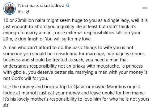 A Nigerian lady, Nnenna Okoronkwo has advised financially stable women not to marry broke men. 10 or 20 million naira might seem huge to you as a single lady, well it is, just enough to afford you a quality life at least but don’t think it’s enough to marry a man, once external responsibilities falls on your 20m, e don finish o! You will suffer my love, she wrote. “A man who can’t afford to do the basic things to wife you is not someone you should be considering for marriage, marriage is serious business and should be treated as such, you need a man that understands responsibility not an oriaku with moustache, a princess with gbola , you deserve better sis, marrying a man with your money is not God’s will for you. Use the money and book a trip to Qatar or maybe Mauritius or just lodge at marriott just eat your money and leave unoka for him mama, it’s his lovely mother’s responsibility to love him for who he is not yours sis. The post It’s his mother’s responsibility to love him for who he is, not yours – Nigerian woman advises financially stable women against marrying broke men appeared first on Time.com.ng.