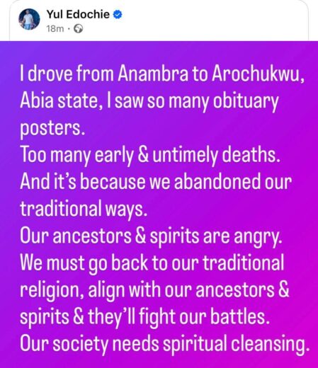 Actor Yul Edochie has raised alarm over the high number of early and untimely de@ths in Nigeria. According to him, he recently travelled from Anambra to Abia state and was taken aback by the number obituaries he saw of young people. He attributed the early de@ths to the ancestors and spirits being angry because many have abandoned traditional ways of worship. He said the society needs spiritual cleansing and every African needs to return to traditional religion.