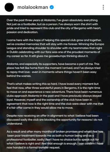 Lookman is reportedly very angry about the situation and wants to leave Atalanta as soon as possible.