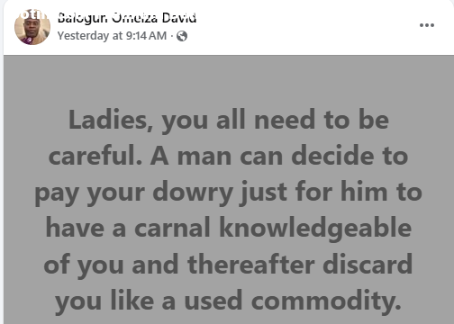 A Nigerian man, Balogun Omeiza David has revealed the extent some men will go to in order to sleep with a woman. According to the broadcaster, some men go as far as paying a woman’s bride price just to get in between her legs only to discard her thereafter. Ladies, you all need to be careful. A man can decide to pay your dowry just for him to have a carnal knowledgeable of you and thereafter discard you like a used commodity, he wrote. The post Be careful. A man can decide to pay your dowry just for him to sleep with you and thereafter discard you like a used commodity – Nigerian man warns ladies appeared first on Time.com.ng.