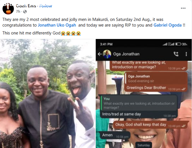 A newlywed man, Jonathan Uko Ogah and his close friend, Gabriel Ogoda, were brutally m8rdered in Benue State.  The incident occurred in the early hours of Monday, August 4, 2025 along the Oju Awarji road in the Ullam axis of Gwer East Local Government Area of the state.   It was gathered that the victims were returning from Oju Local Government Area when they were reportedly ambushed by the armed men.   The attack has sent shockwaves through local communities, sparking widespread condemnation and calls for urgent action from government and security agencies.  A friend of the victims, Drlaff Ijuo Albert, who confirmed the incident said Jonathan got married on Saturday, August 2.  The sad ki!!ing of Jonathan Uko Ogah and Gabriel Ogoda today by a set of TIV folks on their way from Oju to Makurdi is a big hit on the entire nation of Igede. These 2 young guys have always worked genuinely hard, minding their businesses. These are folks we grew up together with. We all know them, he wrote.  Jonathan just got married 2 days ago for crying out loud. What is this…??? Gabriel struggled so hard to move his family to Makurdi, still hustling so hard to keep up with life, and now this. What do we do, where do we go from here…??? Let us all know that there is no form of skirmishes between the Igede and TIV people in that axis, we’re not fighting or whatsoever. How do we explain this heartlessness. This is so painful to hear. To the executive governor of Benue state, His Excellency, Gov. Hyacinth Iormem Alia. To our able Oju/Obi Federal House of Reps Member. Rt. Hon. David A. Ogewu. To our capacity Oju 1 state Constituency Member. Hon. Onah Blessed Emmanuel JP. You are our elected leaders who these young guys have voted for. We are helpless. How do we get justice for our brothers. This is so sad. Where do we go from here. Please look into this for us. For now, my brothers and sisters in Igede land, can we avoid using this Oju Awarji road…??? It is better to pass through Otukpo axis, spend more money, and go through the bad and swampy road over there, and stay alive than to put our lives at high risk on this Achoho road. God… This is terrible. I don’t know whether to say rest in peace or not to my brothers because it looks to me like I’m still dreaming. I can’t even type RIP. I can’t.      The post Newlywed man and his friend brutally m8rdered in Benue appeared first on Time.com.ng.