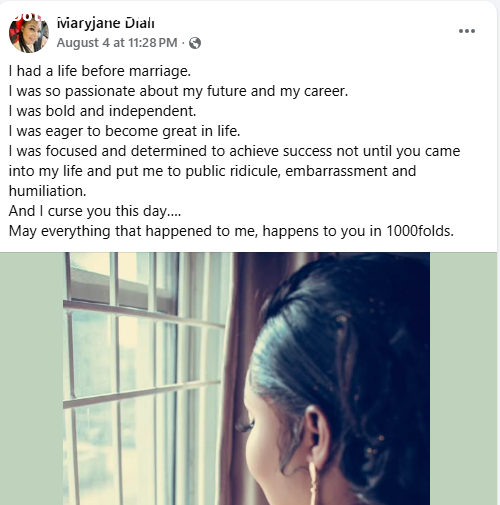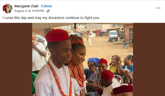 A Nigerian woman, Maryjane Diali, has dragged her ex-husband, saying she cursed the day she married him. In a Facebook post on Tuesday, August 12, 2025, she accused the son of a top politician of giving her ex-husband backups to kill her and take over their properties. Dear faceless bully, intimidator and a son of a top politician in the state, for the past 1 year now you have been secretly fighting me for no just cause. First of all, you started by giving my ex husband all the necessary back ups to eliminate me so that he can have all our properties to himself and to his new found love, she wrote. In a series of posts starting from August 4, she shared photos from their white and traditional wedding ceremonies I curse this day and may my Ancestors continue to fight you,” she captioned the post. It will never be well with you. Go and mark todays date. Your journey to my life will be the end of your Destiny, she wrote. I had a life before marriage. I was so passionate about my future and my career. I was bold and independent. I was eager to become great in life. I was focused and determined to achieve success not until you came into my life and put me to public ridicule, embarrassment and humiliation. And I curse you this day. May everything that happened to me, happens to you in 1000folds. The post I curse this day and may my ancestors continue to fight you – Nigerian woman drags her ex-husband as she shares photos from their wedding appeared first on Time.com.ng.