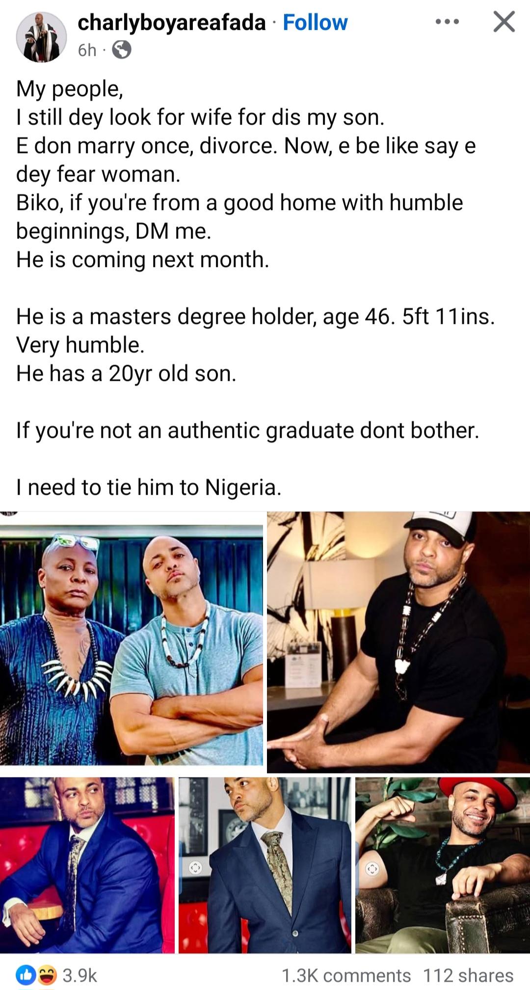 Charles Oputa, better known as Charley Boy or Area Fada, has asked for help to find a wife for his son. He explained that it appears his 46-year-old son now fears women after undergoing a divorce. The entertainer listed his son’s qualities and also the qualities he expects from a prospective wife for his son. He added that his son, who has an adult son of his own, will be coming into the country next month, hence his search. Area Fada wrote on Instagram and Facebook: “My people, I still dey look for wife for dis my son. “E don marry once, divorce. Now, e be like say e dey fear woman. “Biko, if you’re from a good home with humble beginnings, DM me. He is coming next month. “He is a masters degree holder, age 46. 5ft 11ins. Very humble. He has a 20yr old son. “If you’re not an authentic graduate dont bother. I need to tie him to Nigeria.” The post Charlie Boy seeks help in finding a wife for his son, 46, who is divorced and apparently fears women appeared first on Time.com.ng.