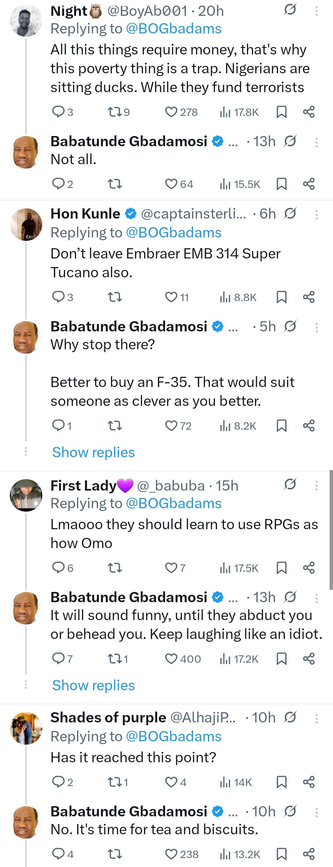 Babatunde Gbadamosi, a businessman, real estate developer, and politician, has urged Nigerians to take up arms to defend themselves against terrorists. He shared the advice on X, sparking divided opinions.He wrote: “Dear Nigerians, Arm Yourselves. Buy Crossbows. Buy AK-47 rifles. Buy GPMGs. Buy RPG Launchers. “Buy LAVs – they are made in Nigeria. Buy Drones. “Learn to use them. “Resist ANY attempt to disarm you. Anybody who tries to disarm you wants you to be murdred. “Age is no excuse. Gender is no excuse. Religion is no excuse. “If you refuse, your de@th at the hands of Fulani Muslim Jihadist Terrorists will be your own fault. #TakeYourFitnessSeriously.” His followers reacted to his tweets by questioning how regular citizens would be able to afford or access arms and drones. See below. The post “Buy AK-47 rifles” Former Lagos State Governorship candidate Babatunde Gbadamosi urges Nigerians to arms themselves against “Fulani Muslim Jihadist Terrorists” appeared first on TIME.I.NG.