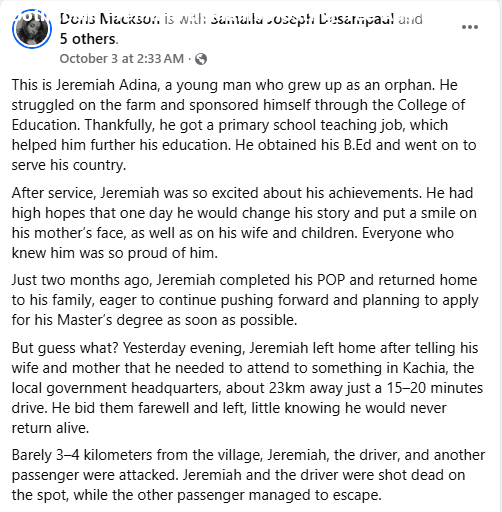 Suspected bandits have k!lled a man, Jeremiah Stephen Adina, in Kaduna State two months after he completed the compulsory National Youth Service (NYSC) programme. It was gathered that Adina left his community, Awon, in Kachia Local Government Area of the state around 6 pm on Thursday, October 2, to go to the local government headquarters, just a 20-minute drive. On the way, the vehicle he boarded was ambushed by gunmen who k!lled him and the driver while other passengers managed to run away. Adina was laid to rest on Friday, October 3 in his hometown. A Facebook user, Doris Mackson,l who knew the victim said his d3ath has thrown his family and community into mourning. According to her, Adina grew up as an orphan and worked on farms to sponsor himself through the College of Education. He later secured a primary school teaching job, obtained a Bachelors degree in Education, and went on to serve the nation. He completed his NYSC passing-out parade (POP) two months ago and was preparing to apply for a Masters degree. Doris described him as a hardworking young man full of hope, who dreamed of changing his story and building a better future for his family. This is Jeremiah Adina, a young man who grew up as an orphan. He struggled on the farm and sponsored himself through the College of Education. Thankfully, he got a primary school teaching job, which helped him further his education. He obtained his B.Ed. and went on to serve his country, she wrote. “After service, Jeremiah was so excited about his achievements. He had high hopes that one day he would change his story and put a smile on his mothers face, as well as on his wife and children. Everyone who knew him was so proud of him. Just two months ago, Jeremiah completed his POP and returned home to his family, eager to continue pushing forward and planning to apply for his Masters degree as soon as possible. But guess what? Yesterday evening, Jeremiah left home after telling his wife and mother that he needed to attend to something in Kachia, the local government headquarters, about 23km away just a 1520 minutes drive. He bid them farewell and left, little knowing he would never return alive. Barely 34 kilometers from the village, Jeremiah, the driver, and another passenger were attacked. Jeremiah and the driver were shot d3ad on the spot, while the other passenger managed to escape. This same Awon village is still grieving Mr. Kwanaki, who was gruesomely k!lled just two days ago, and now another promising young life has been cut short. How many more promising lives like Jeremiahs will we continue to lose? His mother, wife, and children are left shattered. Jeremiah was the backbone of his mother now he is gone. How will they cope? Meanwhile, the government remains silent. Our leaders travel from one nation and city to another while our people are being k!lled. The military bases in our communities seem worthless. Rest well, Adina, Rest well Mr Kwanaki, Adina You were strong and determined to succeed. Your k!llers will pay heavily for this evil act.