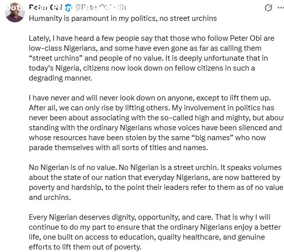 Former presidential candidate of the Labour Party, Peter Obi, has rebuked those describing his supporters as street urchins and low-class Nigerians, saying such language reflects disdain for ordinary citizens and the values that bind the nation. In a post shared on his X handle on Wednesday, October 8, Obi said he found it deeply unfortunate that some Nigerians, especially those in positions of privilege, have resorted to class-based insults against citizens who share in his vision for a better country. The former Anambra state governor said his brand of politics has always been rooted in humanity, empathy, and inclusion, not elitism or class segregation.Humanity is paramount in my politics, no street urchins Lately, I have heard a few people say that those who follow Peter Obi are low-class Nigerians, and some have even gone as far as calling them street urchins and people of no value. It is deeply unfortunate that in todays Nigeria, citizens now look down on fellow citizens in such a degrading manner. I have never and will never look down on anyone, except to lift them up. After all, we can only rise by lifting others. My involvement in politics has never been about associating with the so-called high and mighty, but about standing with the ordinary Nigerians whose voices have been silenced and whose resources have been stolen by the same big names who now parade themselves with all sorts of titles and names. No Nigerian is of no value. No Nigerian is a street urchin. It speaks volumes about the state of our nation that everyday Nigerians, are now battered by poverty and hardship, to the point their leaders refer to them as of no value, and urchins. Every Nigerian deserves dignity, opportunity, and care. That is why I will continue to do my part to ensure that the ordinary Nigerians enjoy a better life, one built on access to education, quality healthcare, and genuine efforts to lift them out of poverty. True leadership is not about mocking the weak, it is about lifting them up.”The post Stop calling my supporters street urchins – Peter Obi replies critics appeared first on TIME.I.NG.