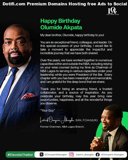 Senior Advocate of Nigeria and former Chairman of the Nigerian Bar Association (NBA) Lagos Branch, Mr. Yemi Akangbe, SAN, has extended warm birthday wishes to former NBA President, Olumide Akpata, describing him as an exceptional leader and trusted friend whose impact continues to inspire many within and beyond the legal profession.