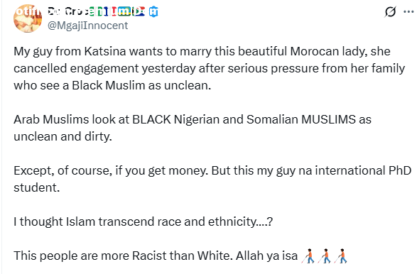 A Moroccan woman has called off her engagement to her Nigerian fianc over family pressure. The man’s friend, Mgaji Innocent, who disclosed this via X on Wednesday, October 8, said the lady took the decision because her family see black Muslims as unclean. My guy from Katsina wants to marry this beautiful Moroccan lady, she cancelled engagement yesterday after serious pressure from her family who see a Black Muslim as unclean. Arab Muslims look at BLACK Nigerian and Somalian MUSLIMS as unclean and dirty. Except, of course, if you get money. But this my guy na international PhD student. I thought Islam transcend race and ethnicity.? This people are more Racist than White. Allah ya isa, he wrote. The post Moroccan woman calls off her engagement to Nigerian fianc over her family who sees black Muslims as ‘unclean’ appeared first on TIME.I.NG.