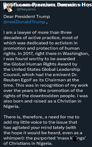 Nigerias Minister of Aviation and Aerospace Development, Festus Keyamo, has directly refuted claims made by US President Donald Trump alleging mass or targeted k!llings of Christians in Nigeria.In an open letter posted on X on Wednesday, November 5, the Minister insisted that such accusations do not reflect the realities in the country and instead sought Trumps cooperation to confront terr0r!sm.Keyamo, a Senior Advocate of Nigeria and long-standing human rights lawyer, appealed to Trump to deepen collaboration with Nigeria in the f!ght against terr0r!sm rather than rely on what he described as inaccurate external narratives.Keyamo, who noted he was born and raised as a Christian, reminded President Trump of his decades-long activism, including receiving the Global Human Rights Award in Washington in 2017.He strongly pushed back against the international allegations: It is simply not true that Christians are being specifically targeted in Nigeria for pers3cution, k!llings, or har@ssment on account of their faith. He added, It would have been unconscionable for me to serve in any government that targets Christians.The Minister explained that the vi0lence Nigeria faces stems from extremist and cr!minal groups like Boko Haram, @rmed herdsmen, and cattle rustlers. He stressed that these security challenges predate the current administration and have affected citizens of all religious backgrounds.Keyamo defended the federal governments commitment to religious tolerance and the Nigerian Constitution, stating: “Nigeria is a secular state,” which “guarantees freedom of religion and prohibits the adoption of a state religion.”Regarding Government Composition, he highlighted that President Bola Ahmed Tinubu, despite being Muslim, is widely regarded as a moderate leader with strong ties to the Christian community; his wife is a pastor in a major Pentecostal church, and many of his children are practicing Christians.Furthermore, Keyamo pointed out that many of the Service Chiefs appointed by the President are Christians, arguing it would be illogical to claim they were complicit in any faith-based k!llings. He concluded by urging Trump and the U.S. government to seek more balanced information on Nigeria and collaborate with the Nigerian government to tackle the long-standing problems of terr0r!sm and insurgency.”We ask that you broaden your sources of information to gain a balanced view of events in Nigeria, he wrote, calling for strengthened bilateral ties and reaffirming Nigerias commitment to peace. Dear President Trump @realDonaldTrump , I am a lawyer of more than three decades of active practice, most of which was dedicated to activism in promotion and protection of human rights. In 2017, right there in Washington, I was found worthy to be awarded the Global Human Rights Festus Keyamo, SAN, CON, FCIArb (UK) (@fkeyamo) November 5, 2025 The post Claims of targeted k!lling of Christians in Nigeria are false Festus Keyamo says in open letter to Trump appeared first on TIME.I.NG.
