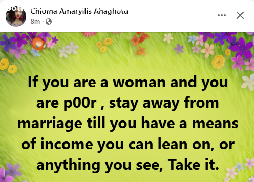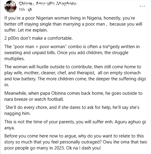 Media personality, Chioma Ahaghotu, has said that a poor Nigerian woman living in Nigeria has no business marrying a poor man.   Ahaghotu, who stated this in a Facebook post on Wednesday, November 5, 2025, described the poor man + poor woman union as a ‘tragedy written in sweating and unpaid bills’  According to her, children bear the brunt of such unions due to lack of access to essential resources and parental care while the women not only hustle to provide for the family but also play wife, mother, cleaner, chef, and therapist.  “If youre a poor Nigerian woman living in Nigeria, honestly, youre better off staying single than marrying a poor man , because you will suffer. Let me explain,” she wrote. P00rs don’t make a comfortable. The poor man + poor woman combo is often a tra*gedy written in sweating and unpaid bills. Once you add children, the struggle multiplies. The woman will hustle outside to contribute, then still come home to play wife, mother, cleaner, chef, and therapist, all on empty stomach and low battery. The more children come, the deeper the suffering digs in. Meanwhile, when papa Obinna comes back home, he goes outside to nara breeze or watch football. Shell do every chore, and if she dares to ask for help, hell say shes nagging him. This is not the time of your parents, you will suffer enh. Aguru aghuo gi anya. Before you come here now to argue, why do you want to relate to this story so much that you feel personally outraged? Owu ihe oma that two poor people go marry in 2025. Ok na I dash you.   The post If you are a poor Nigerian woman living in Nigeria, youre better off staying single than marrying a poor man Media personality , Chioma Amaryllis Ahaghotu says appeared first on TIME.I.NG.