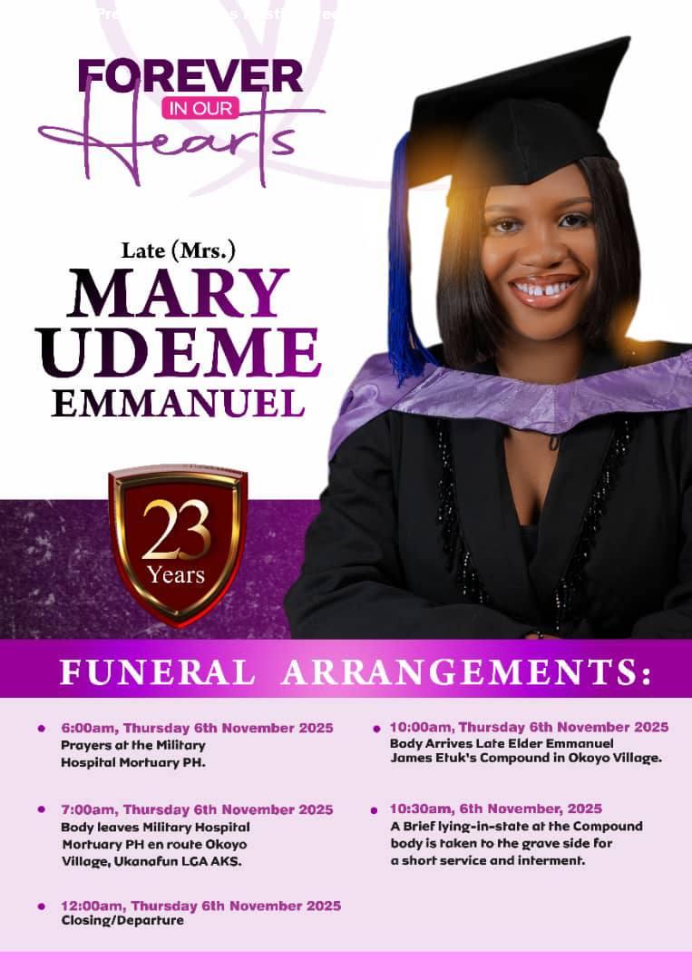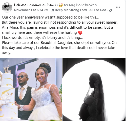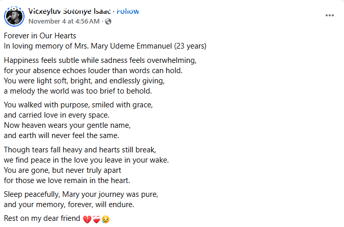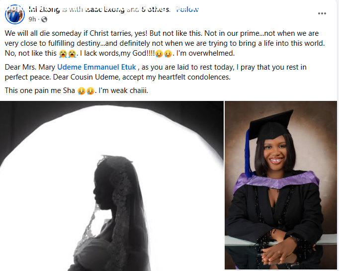 A Nigerian man, Udeme Etuk Emmanuel, has been thrown into mourning following the d3ath of of his 23-year-old wife, Mary, barely a year after their wedding.   The couple got married on November 2, 2024.    It was gathered that Mary d!ed a few days ago after giving birth to their first child. Tragically, the newborn baby also d!ed.   The remains of Mary and the baby were laid to rest on Thursday, November 6, 2025 at Okoyo Community, Ukanafun Local Government Area of Akwa Ibom State.The grieving widow, family members and friends took to Facebook to pay touching tributes to the young woman.  Our one year anniversary wasn’t supposed to be like this. But there you are, laying still not responding to all your sweet names. Afia Mma, this pain is enormous and it’s difficult to be sane… But a small cry here and there will ease the hurting. I lack words, it’s empty, it’s blurry and it’s tiring. Please take care of our Beautiful Daughter, she slept on with you. On this day and always, I celebrate the love that d3ath could never take away, Emmanuel wrote.  A cousin, Ini Ekong, wrote: We will all d!e someday if Christ tarries, yes! But not like this. Not in our prime…not when we are very close to fulfilling destiny…and definitely not when we are trying to bring a life into this world. No, not like this. I lack words, my God!!!!. I’m overwhelmed. Dear Mrs. Mary Udeme Emmanuel Etuk , as you are laid to rest today, I pray that you rest in perfect peace. Dear Cousin Udeme, accept my heartfelt condolences. This one pain me Sha. I’m weak chaii. Fon Felix wrote: “BEAUTY FOR ASHES. Got married at age 22. Would have begun motherhood at age 23. Unfortunately fate says no. Just a few days to celebrate their One year Marriage Anniversary, the cold hands of death snatched her with the new born baby. Late Mary Udeme Emmanuel was a beauty to behold. So sad it happened this way. Today the remains of Late Mary and the baby were committed to mother Earth at Okoyo Community, Ukanafun LGA Akwa Ibom. We’ve registered our heartfelt condolences to the husband, Mr Udeme Emmanuel Etuk the immediate and Extended Etuk’s family. It’s surely a trying and difficult time to imagine. May God Forbid! Life is indeed a glaring stage: for no one knows when, where and how to bow out.”      The post This pain is enormous – Nigerian man mourns as his 23-year-old wife and baby d!e during delivery few days to their one year wedding anniversary appeared first on TIME.I.NG.