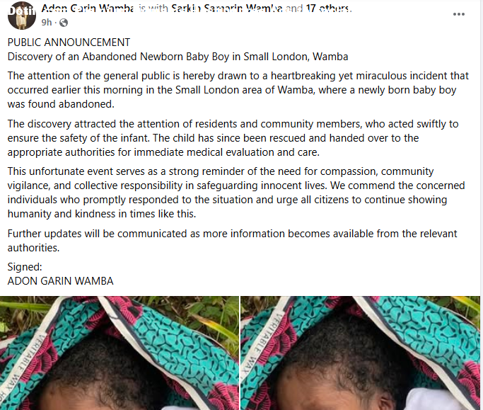 An abandoned newborn baby boy has been rescued alive by residents in Wamba Local Government Area of Nasarawa State. The Adon Garin Wamba, Mohammed Zaharadeen, confirmed the incident in a statement on Sunday morning, November 9, 2025. According to the statement, the abandoned infant was found in the Small London area of Wamba on Sunday and handed over to the appropriate authorities for immediate medical evaluation and care. In an update, Zaharadeen revealed that the mother of the child has been identified but the baby won’t be released to her due to her act of neglect. Following the discovery of a newborn baby boy earlier today in Small London, Wamba, we wish to inform the general public that the mother of the child has been identified. She hails from a village in Wamba known as Bambu, the statement read. “After careful consideration of the circumstances surrounding the incident, His Royal Highness, Alhaji Lawal Musa Nagogo, has directed that the baby should not be released to the mother due to her act of neglect. “However, the mother will be permitted to visit the Oriye Rindre palace in Wamba solely to breastfeed the baby under supervision, after which she will return to her residence. “The baby remains under the care and protection of his royal highness and community authorities, receiving appropriate medical attention and support. We appreciate the swift and compassionate responses from community members, hospital staff, and all individuals who have shown concern. This situation serves as a reminder of our shared responsibility to protect the lives and welfare of innocent children. The post Abandoned newborn baby rescued in Nasarawa appeared first on Time.com.ng.