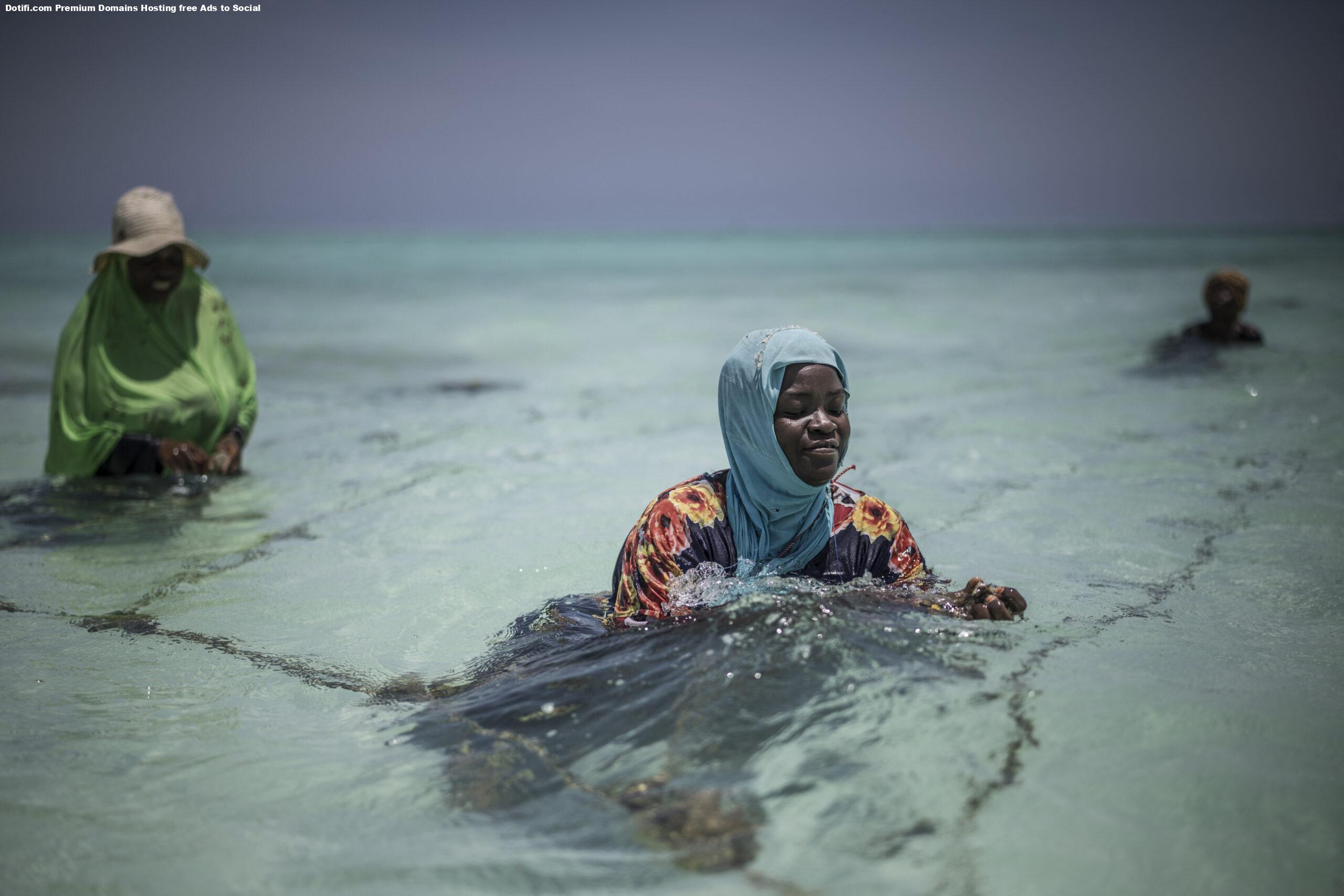 Around 10 in the morning each day, women in hijabs and loose long dresses wade through Zanzibar’s turquoise shallow tides to tend their sponge farms — a new lifeline after climate change upended their former work.