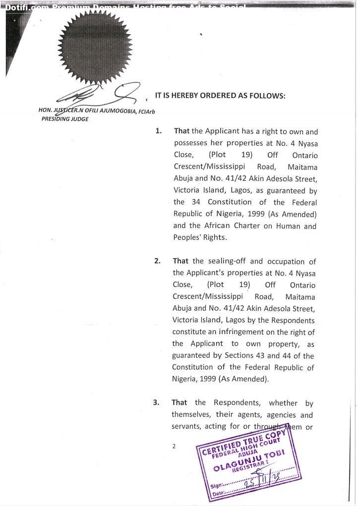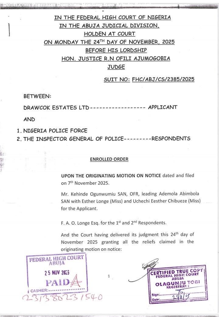 Read the statement bu Drawcok Estate belowA Federal High Court sitting in Abuja has ordered the Nigerian Police Force as well as the Inspector-General of Police, Mr. Kayode Egbetokun not to go near the building which occupies Nestoil Group on No. 41/42 Akin Ademola Street, Victoria Island in Lagos State as it belongs to Drawcok Estates LTD.Drawcok Estates LTD had on November 7, 2025 through Mr. Kehinde Ogunwumiu, SAN, Ademola Abimbola, SAN with Esther Longe and Uchechi Chibueze prayed to the court to order the Nigerian Police Force and the IGP who are the first and second respondents not to interfere with or impend or violate her (applicant) right to own the properties on No. 4 Nyasa close, plot 19, Off Ontaria crescent /Mississippi road, Maitama Abuja and 41/42 Akin Adesola Street, Victoria Island, Lagos State as guarantees by the chapter 4 of the Constitution of the Federal Republic of Nigeria 1999 as amended as it only relates to the complaint litigated in the suit. Delivering the judgement in suit number FHC/ABJ/CS/2385/2025 on November 24, 2025, the presiding judge, Honourable Justice R.N. Ofili Ajumogobia ruled that that the applicant has a right to own and possess her properties as mentioned in the addresses above as guaranteed by the 34 Constitution of the Federal Republic of Nigeria, 1999 as amended and the African Charter on Human and Peoples Rights. Justice Ajumogobia stressed further in her ruling that the sealing-off and occupation of the applicants properties on the addresses mentioned above by the Respondents constitute an infringement on the right of the applicant to own property, as guaranteed by Sections 43 and 44 of the he Constitution of the Federal Republic of Nigeria, 1999 as amended.The judge also ruled that the Respondents, whether by themselves , their agents, agencies and servants, acting for it through them or any other person(s) howsoever described or claiming through them, to vacate the applicants properties on the addresses mentioned above, and deliver possession over to the applicant forthwith.Ajumogobia stressed that the Respondents, whether by themselves, their agents, agencies, and servants, acting for or through them or any other person(s) howsoever described or claiming through them, to provide security for the applicant to take back possession of her properties on the addresses mentioned above.She also gave an order that the Respondents is restrain, whether by themselves, their agents, agencies and servants, acting for or through them or any other person(s) howsoever described or claiming through them, from harassing the applicant and refusing her access to her properties on the addresses mentioned above. The post Court reportedly bars Police, IGP from disturbing owners of Nestoil premises* appeared first on Time.com.ng.