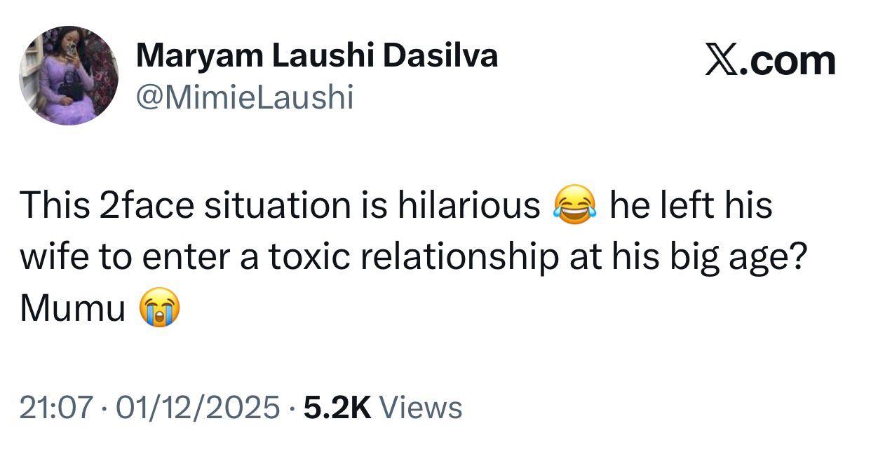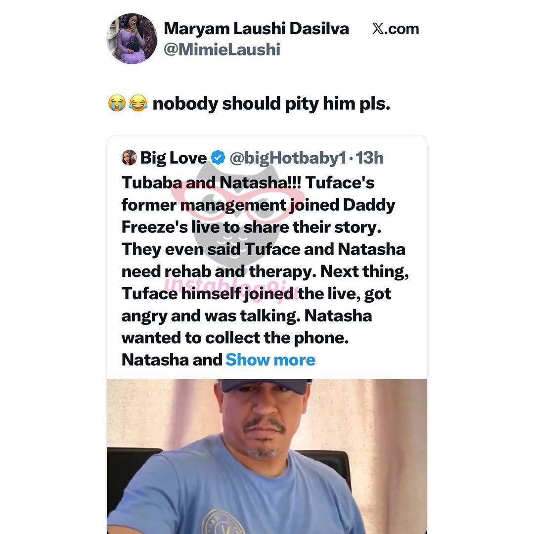 Mariam Leo DaSilva, wife of reality TV star, Leo DaSilva, has knocked singer 2Face Idibia following reports of marital crisis with his new wife, Natasha Igbinedion. Recall that on Monday, December 1, the singer’s former manager, Kaka Igbokwe, made shocking revelations about the singer and his union. He alleged that 2Face was in a tox!c relationship with Natasha, who he said is v!olent to the singer. He claimed that 2Face constantly lives in fear as Natasha has been v!olent towards him since they began seeing each other. She also alleged that the couple abuse dr#gs and need to be checked into rehab and undergo therapy. Reacting to the revelations, Mariam addressed 2Face as a mumu” and asked that none should feel pity for him. The post Mumu. Nobody should pity him- Reality TV star, Leo Dasilvas wife, Mariam, shares her thoughts on legendary musician, 2Face Idibias alleged marriage crisis appeared first on TIME.I.NG.