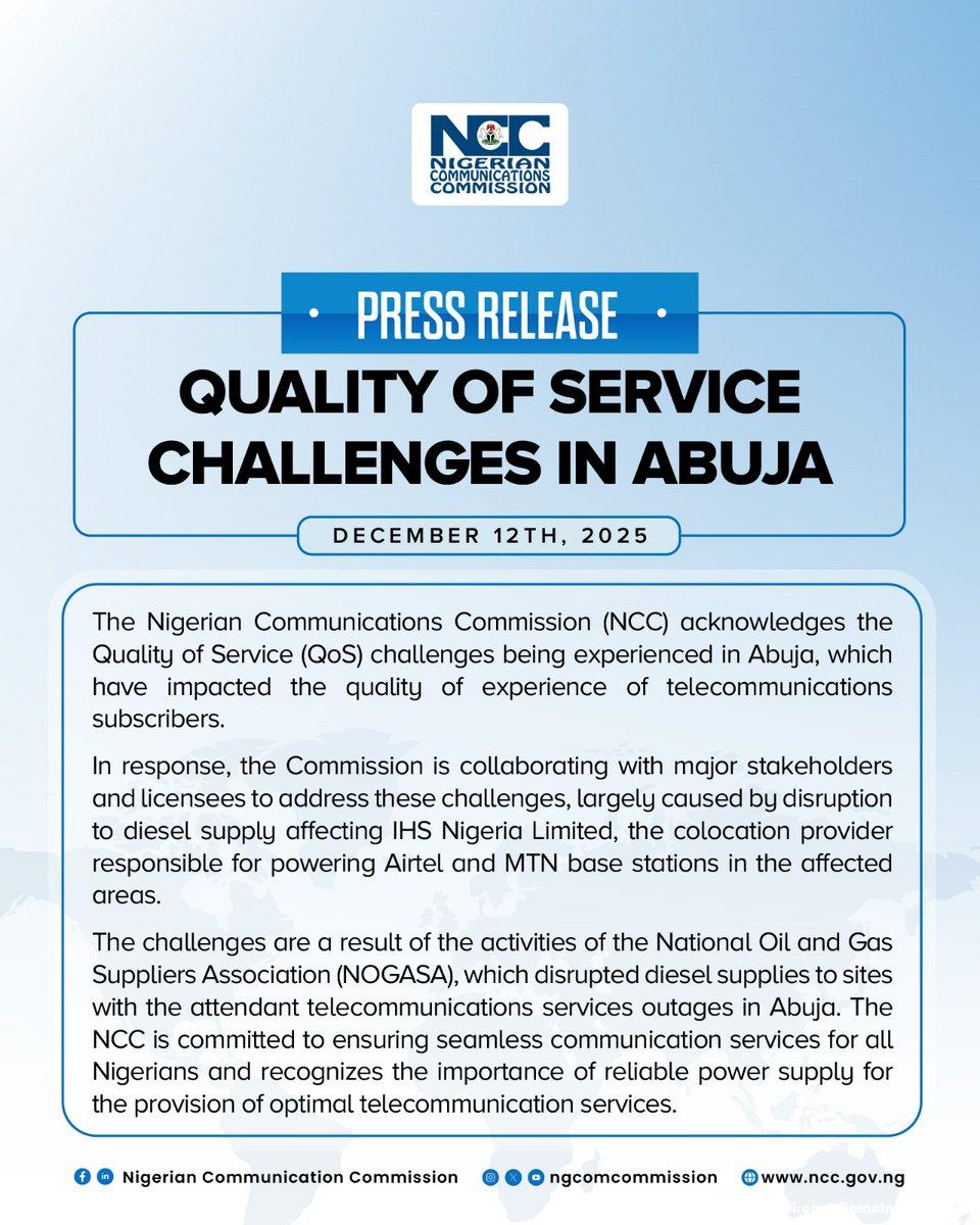 The Nigerian Communications Commission (NCC) acknowledges the Quality of Service (QoS) challenges being experienced in Abuja, which have impacted the quality of experience of telecommunications subscribers.