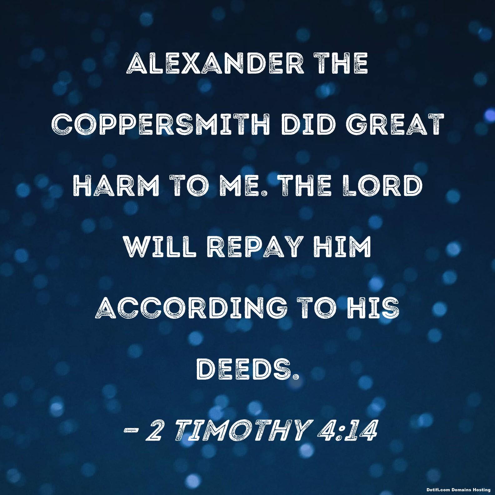 - The Verse: In the King James Version (KJV), it reads: “Alexander the coppersmith did me much evil: the Lord reward him according to his works”.