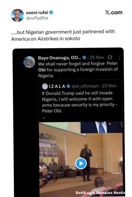 Media personality, Rufai Oseni, has called out a perceived contradiction in the federal governments security posture, following reports of cooperation between Nigeria and the United States on airstrikes in Sokoto State. Oseni raised the issue on X, pointing to recent security collaboration with the United States months after a statement by presidential aide Bayo Onanuga criticising opposition figure Peter Obi over comments linked to U.S. involvement in Nigerias fight against insecurity. Sharing a screenshot of Onanugas earlier post, Rufai wrote: but Nigerian government just partnered with America on Airstrikes in Sokoto. The post referenced a November comment by Onanuga in which he said: We shall never forget and forgive Peter Obi for supporting a foreign invasion of Nigeria, reacting to remarks attributed to Obi suggesting he would welcome help from former U.S. president Donald Trump in addressing Nigerias security challenges. Rufais comment comes amid reports that Nigerian authorities worked with U.S. counterparts on air operations targeting armed groups in parts of Sokoto State, a development that has reignited debate online over consistency in official messaging.