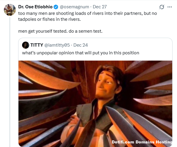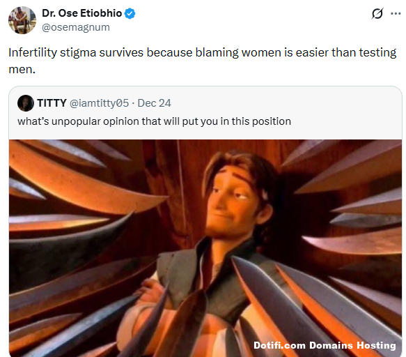 A Nigerian doctor, Ose Etiobhio, has said that infertility affects both men and women but the stigma surrounding the issue remains prevalent due to lack of male testing because it’s easier to blame women. Infertility stigma survives because blaming women is easier than testing men, he wrote on Saturday. Too many men are shooting loads of rivers into their partners, but no tadpoles or fishes in the rivers. men get yourself tested. do a semen test.”