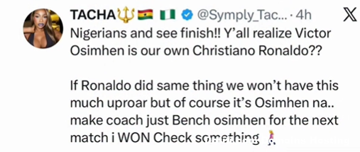 BBNaija’s Tacha has slammed Nigerians who have been criticizing Victor Osimhen following the confrontation he had with his teammate Ademola Lookman on the pitch during Nigerias 4-0 win against Mozambique in the Africa Cup of Nations last night, January 5. The reason behind the outburst isnt clear, but Lookman had made one assisted Osimhens goal before the outburst broke out. While Osimhen charged at Lookman, the latter kept his cool. Many Nigerians took to social media to slam Osimhen over his action. Berating those criticizing Osimhen, Tacha in a post shared on her X-handle said the reason behind the criticism is because they have seen Osimhen finish”. She asked if Nigerians realize that Osimhen is the Cristiano Ronaldo in the Super Eagles. She further asked if Nigerians would have criticized Ronaldo if he did the same thing Osimhen did.Watch the video she shared below View this post on Instagram A post shared by TIME.I.NG (@dotifidigital) The post Nigerians and see finish!! If Ronaldo did same thing we wont have this much uproar- Tacha slams Nigerians criticizing Osimhen over his clash with Lookman on the pitch appeared first on Time.com.ng.