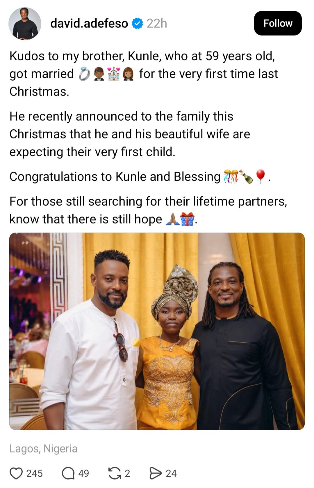 David Adefeso, the Nigerian-American entrepreneur who dated American singer Tamar Braxton, has congratulated his brother on his wedding. He revealed that his 59-year-old brother just got married for the first time. He added that he is now expecting a child with his wife. 55-year-old David (pictured in black) shared a photo of the newlyweds and wrote: “Kudos to my brother, Kunle, who at 59 years old, got married for the very first time last Christmas. “He recently announced to the family this Christmas that he and his beautiful wife are expecting their very first child. “Congratulations to Kunle and Blessing. “For those still searching for their lifetime partners, know that there is still hope.” The post “There is still hope” David Adefeso says as he congratulates his brother who got married for the first time at 59 and is now expecting first child with young bride appeared first on Time.com.ng.