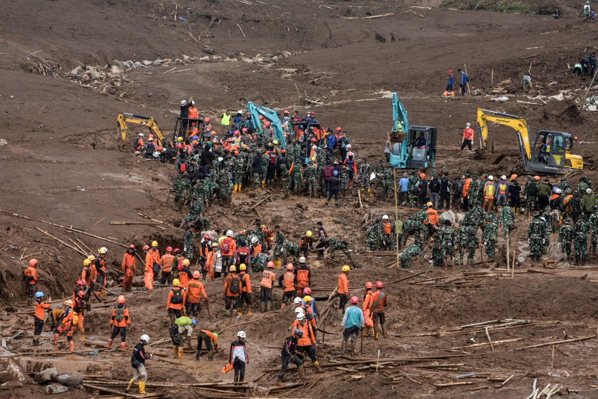 Rescuers search for victims buried by a landslide in Pasirlangu village in Cisarua, Bandung, West Java, on January 26, 2026. The death toll in a massive Indonesian landslide hit 17 on January 26 as rescuers used heavy equipment to hunt for dozens still missing days after heavy rains unleashed a torrent of mud. (Photo by Timur Matahari / AFP)