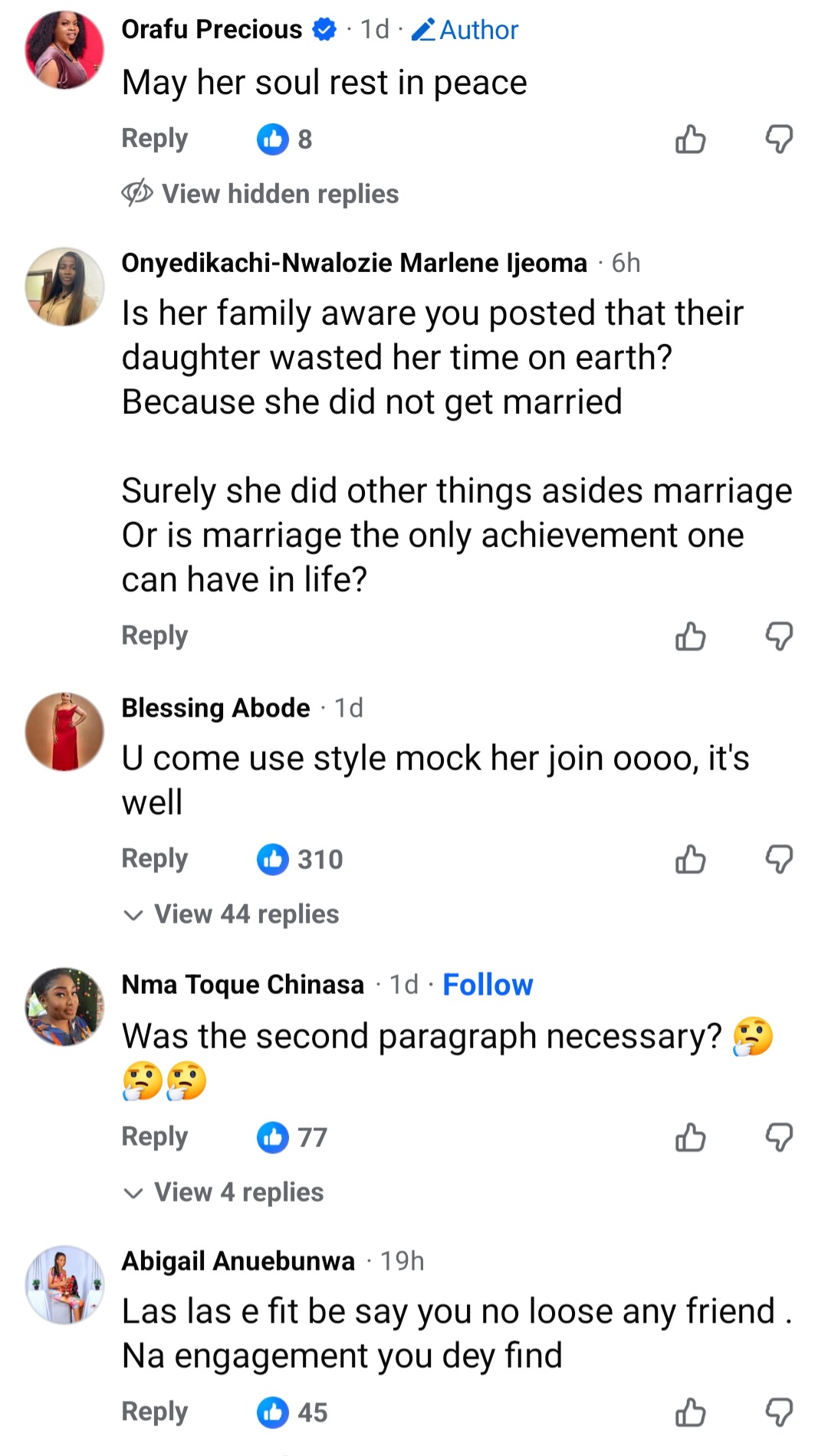 A woman has been told that she is an “enemy”, not a friend after she made a post on Facebook to announce the dath if someone she calls her friend. Orafu Precious wrote: “Lost a friend today in a fibroid operation . “What a life ! No marriage, no husband ,no child, no achievement. “Just a wasted years.” Facebook users have now slammed Precious for her post. See below.  The post “With a friend like you, who needs enemies?” Woman slammed over insensitive post announcing the de@th of her “friend” appeared first on TIME.I.NG.