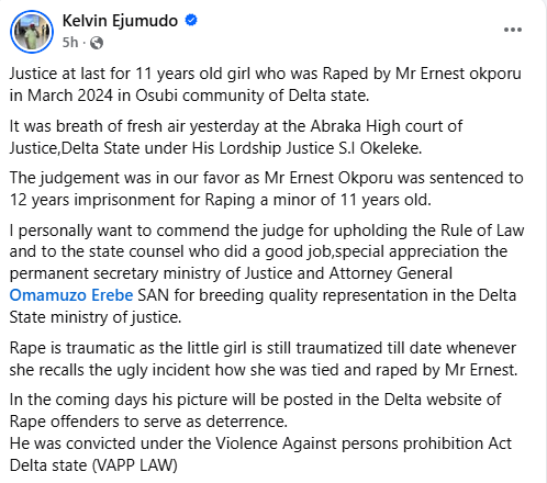 A Delta State High Court sitting in Abraka, Ethiope-East Local Government Area has sentenced one Ernest Okporu to 12 years imprisonment for r@ping his landlord’s 11-year old daughter. LIB reported that the incident occurred in March 2024 at Osubi community, in Okpe Local Government Area. Okporu, 41, had asked the victim to go bring his charger from his apartment. He followed her, grabbed her from the back, tied her hands to the back and violently def!led her. Justice S.I Okeleke handed down the sentence in a judgement on Thursday, February 5, 2026. A human rights activist and Senior Special Assistant to the Governor on Human Rights, Kelvin Ejumudo, who handled the case confirmed the sentencing in a Facebook post on Friday. Ejumudo, who doubles as National Secretary of Human Rights Protection Congress, HRPC, said the minor is still traumatized whenever she recalls the ugly incident. He commended the judge for upholding the Rule of Law as well as the Permanent Secretary, Ministry of Justice, Omamuzo Erebe, SAN for a quality representation while the matter lasted in court. Justice at last for 11 years old girl who was r@ped by Mr Ernest okporu in March 2024 in Osubi community of Delta state. It was a breath of fresh air yesterday at the Abraka High court of Justice, Delta State under His Lordship Justice S.I Okeleke, he wrote. “The judgement was in our favor as Mr Ernest Okporu was sentenced to 12 years imprisonment for Raping a minor of 11 years old. “I personally want to commend the judge for upholding the Rule of Law and to the state counsel who did a good job, special appreciation to the permanent secretary ministry of Justice and Attorney General Omamuzo Erebe SAN for breeding quality representation in the Delta State ministry of justice. “Rape is traumatic as the little girl is still traumatized till date whenever she recalls the ugly incident how she was tied and raped by Mr Ernest. In the coming days his picture will be posted in the Delta website of Rape offenders to serve as deterrence. He was convicted under the Violence Against persons prohibition Act Delta state (VAPP LAW). I also wish to appreciate His Excellency my principal the Executive Governor of Delta Statem Rt Hon Sheriff Oborevwori, state, who have zero tolerance for Rape and defilement cases and other related matters. The post Court sentences man to 12 years imprisonment for r@ping his landlord’s 11-year-old daughter in Delta appeared first on Time.com.ng.