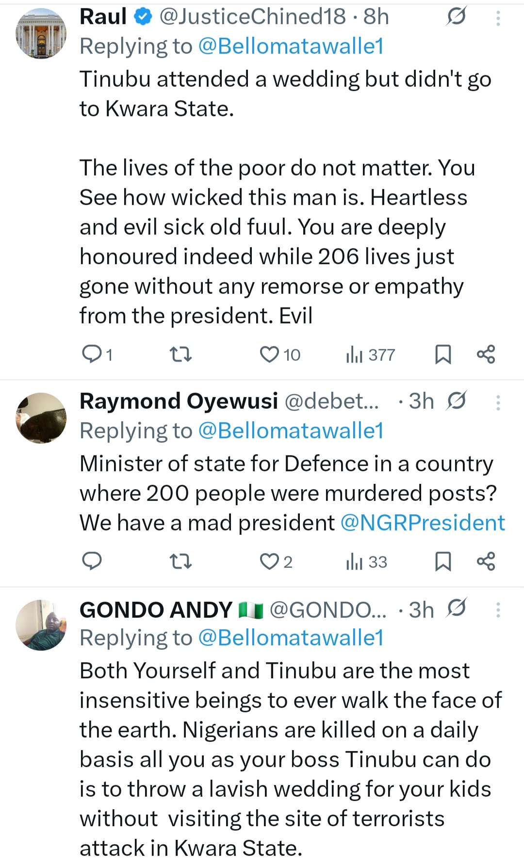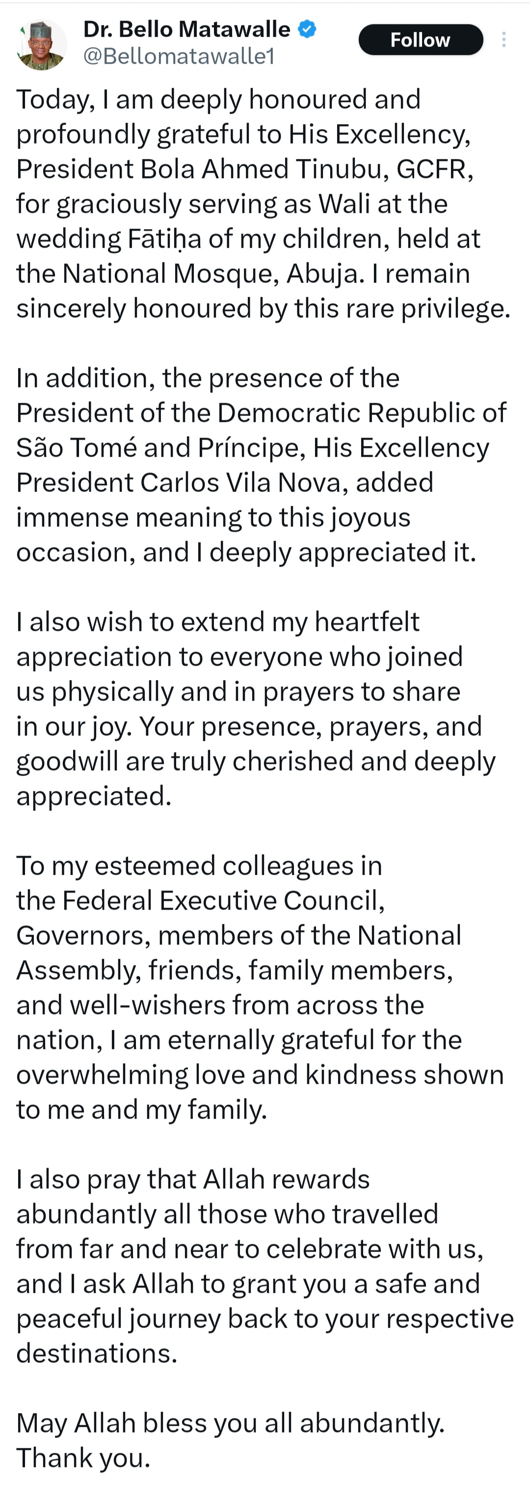 Dignitaries from Nigeria and other countries converged in Abuja on Friday, Feb. 6, for the wedding fatiha of 10 children of the Minister of State for Defence, Bello Matawalle, who all got married in one day. The wedding ceremony held in the National Mosque Abuja after which they proceeded to a big hall where the reception for all 10 children took place. Nigeria’s President Bola Tinubu was in attendance and even received the brides on behalf of the Matawalles into the family. The President of So Tom and Prncipe, Carlos Vila Nova, also attended the ceremony alongside Tinubu. Also present were the Deputy Senate President, Senator Jubril Barau, and Senior Special Assistant to the President on Politics and Other Matters, Ibrahim Masari.Governors at the event included Ahmad Aliyu of Sokoto State, Umar Namadi of Jigawa State, and Nasir Idris of Kebbi State. Matawalle, a former governor of Zamfara State, gave out five of his daughters: Maryam, Safiyya, Farida, Nana Firdausi, and Aisha, in marriage. Five of his sons: Ibrahim, Abdul Jalal, Surajo, Bello, and Fahad, also got married on the same day. The officiating Imam, Prof. Luqman Zakariyah, prayed to Allah to bless the marriages, grant success to the couples in their life journeys, and bless their parents and grandparents. On X (formerly Twitter) Matawalle thanked Tinubu for serving as “Wali” at his children’s wedding fatiha which held at the National Mosque Abuja. Nigerians took to the post to express outrage that Tinubu attended the wedding but did not go to Kwara State where terrorists k!lled scores of innocent citizens just hours earlier.